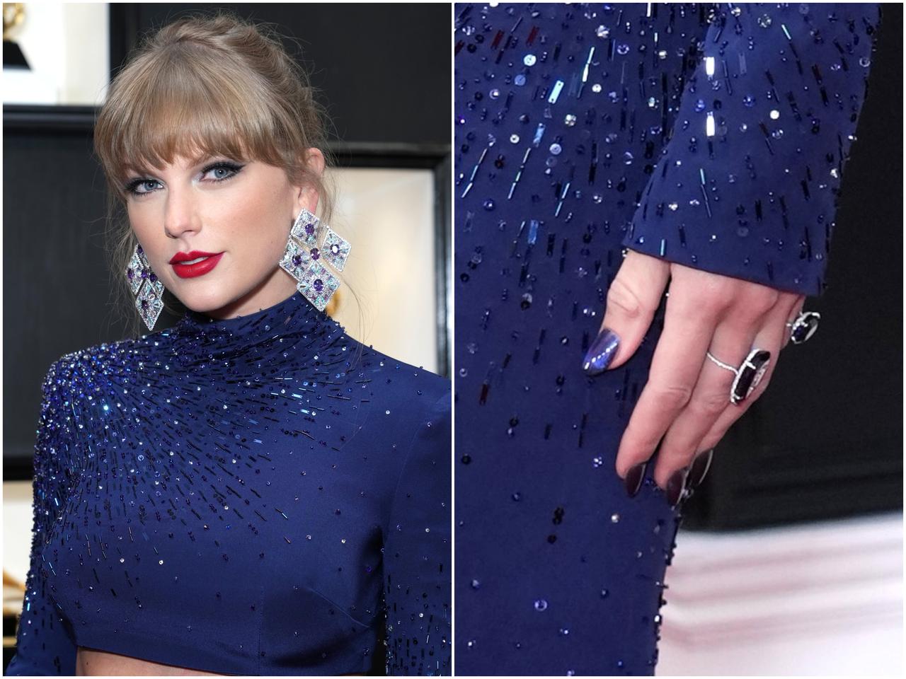 シンガーのテイラー・スウィフトは、新作アルバム『Midnights』をイメージしたロベルト カヴァリ(Roberto Cavalli)のネイビードレスで登場。キラキラとした衣装とアイメイクに合わせるように、ネイルも光沢感のあるネイビーブルーで統一。