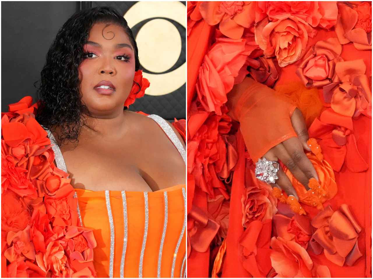 シンガーのリゾは、ドルチェ&ガッバーナ(Dolce & Gabbana)のフローラルドレスに合わせて、メイクからネイルまでオレンジ色で統一。立体的で鮮やかなバラのネイルパーツが、指先に奥行きを与えてくれる。