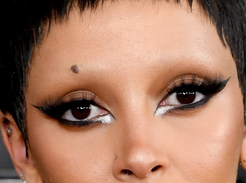 レッドカーペットでは毎回お目立ち度抜群のメイクを披露しているドージャ・キャットは、極太のアイラインでつくる囲み目アイメイクに。目頭の切開ラインと目尻の跳ね上げラインをオーバーぎみに引き、目頭の下にはホワイトのキラキラをオンすることで、究極のデカ目メイクをつくり上げた。