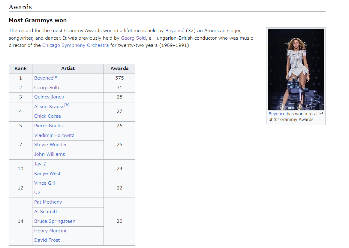 日本時間2月6日に開催された第65回グラミー賞授賞式で、ビヨンセが最優秀ダンス/エレクトロニック・レコーディング賞、最優秀ダンス/エレクトロニック・アルバム賞、最優秀トラディショナルR&Bパフォーマンス賞を受賞して、累計受賞数を32に更新。これまで最多受賞歴を誇っていた指揮者兼ピアニストのゲオルク・ショルティの31受賞を超えて、史上最もグラミー賞を受賞したアーティストとなった。