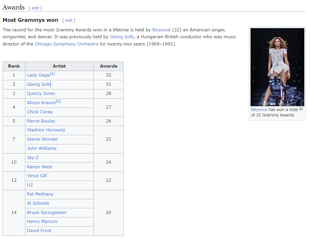 記録が変わるアワードのようなイベントのあとはウィキペディアの情報を書き換えるウィキペディアンが大量に活動を始め、今年もそれは例外ではない。とくに今年は、ずっと変わらなかった「史上最多受賞記録」が書き換えられる記念すべきイヤー。Grammy Award milestones(グラミー賞での歴史的な出来事)というページには注目が集まっていた。