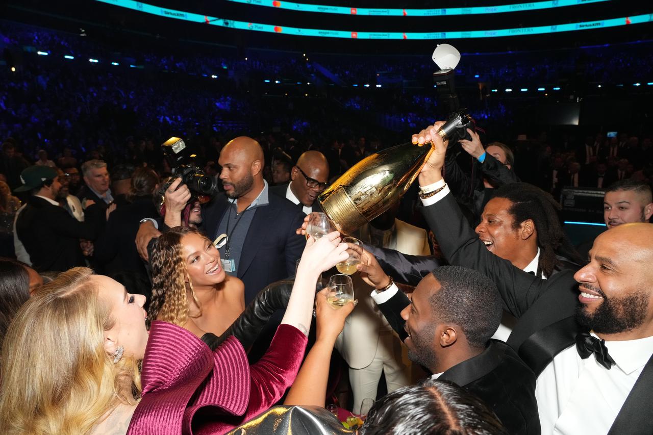 第65回グラミー賞授賞式で3冠を達成したビヨンセが史上最もグラミー賞を受賞したアーティストとなったことを受けて、じつは客席では、セレブたちがそれを祝い酒盛りをしていた。