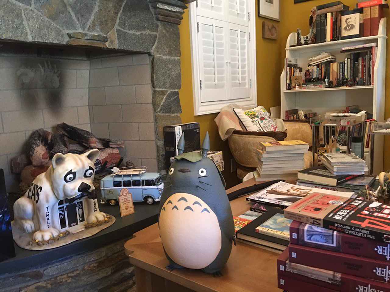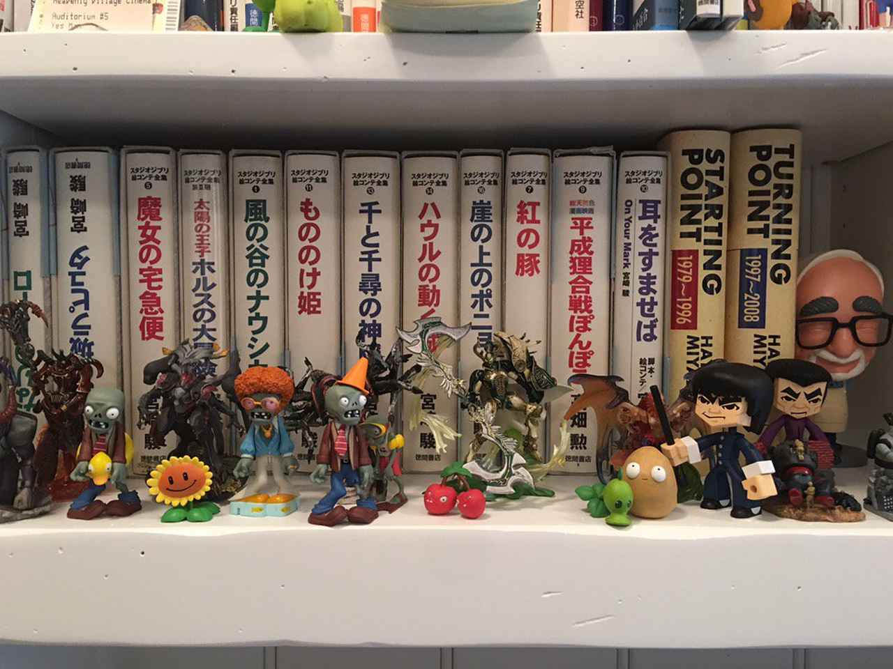 ちなみに監督の自宅の本棚にはアニメ、マンガ、日本セクションがあり、小泉八雲や水木しげる、手塚治虫、楳図かずお、浦沢直樹、今畝などの多くの本が並ぶ。そしてもちろんジブリの本やグッズもあるのだが、なかには宮崎監督本人がモチーフのフィギュアまであった。