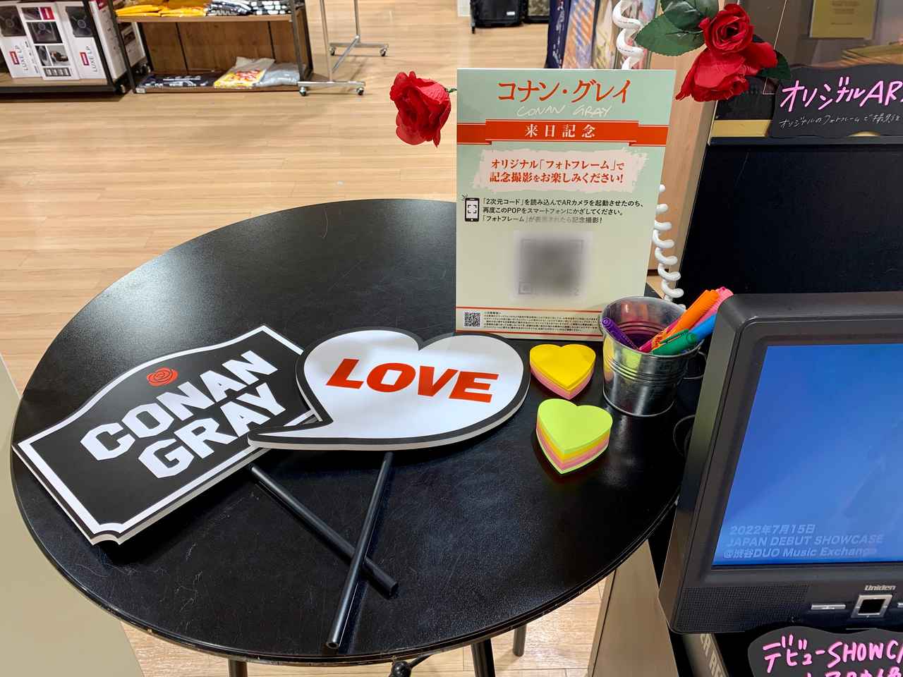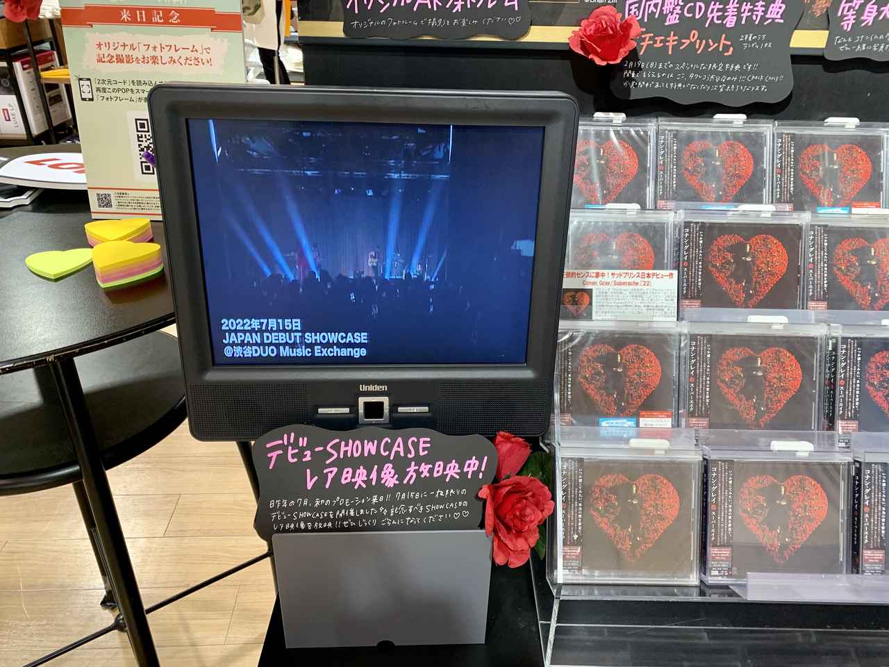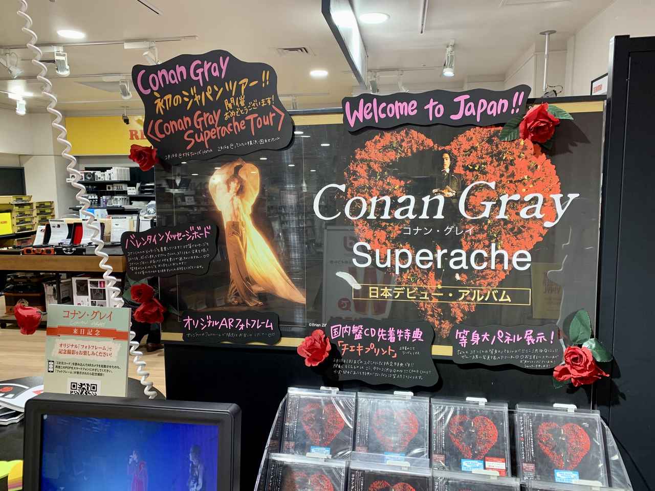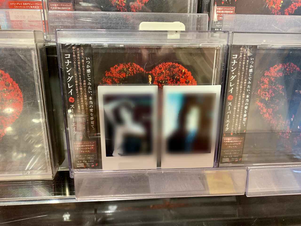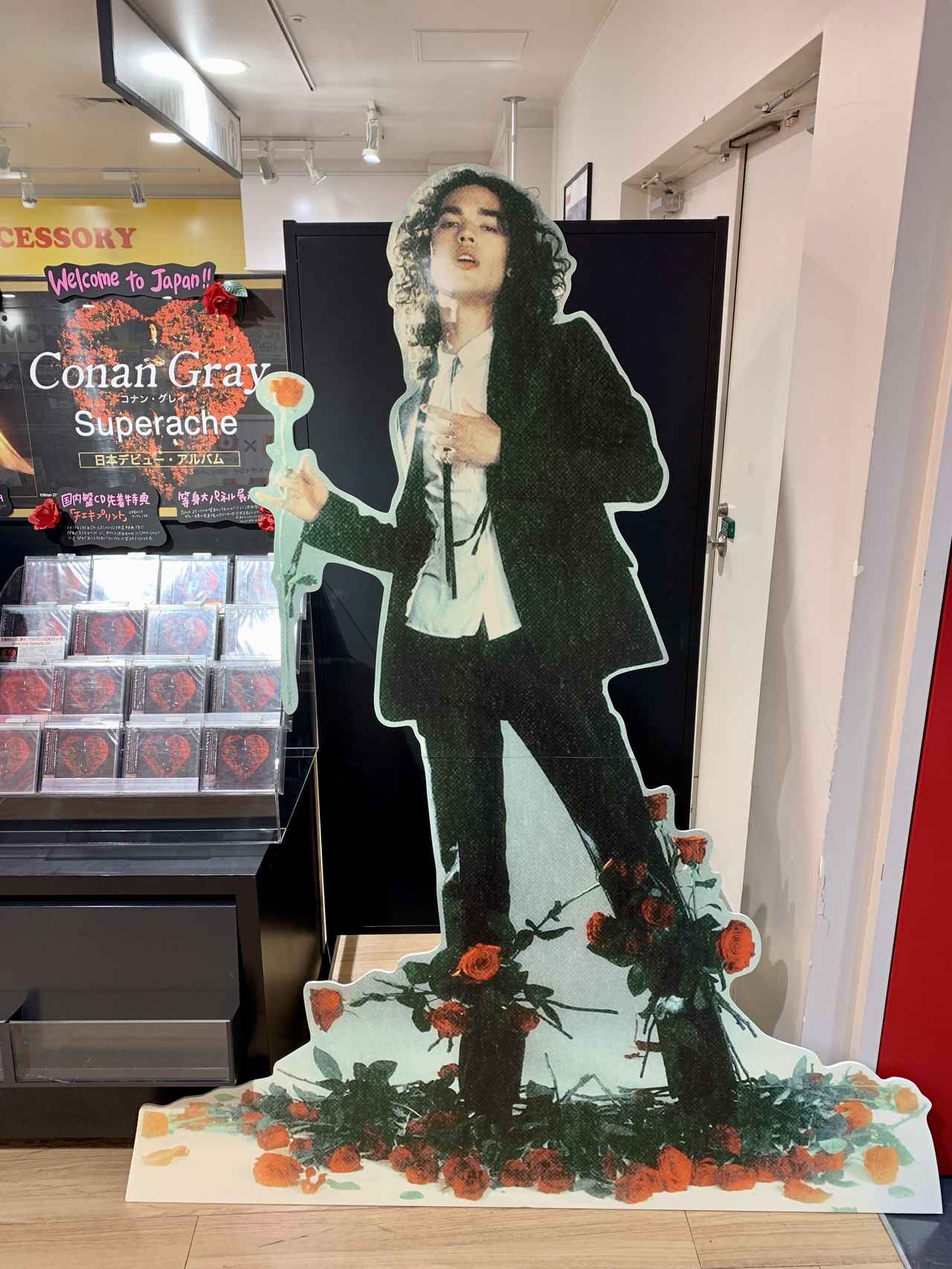 等身大パネルの隣では、日本デビューアルバム『スーパーエイク』のCDが発売されている。『スーパーエイク』といえば、バラに囲まれたコナンのアートワークが印象的なアルバムだが、今回の展示では同作の世界観に忠実に、バラも飾られている。また、パネル展実施店舗で『スーパーエイク』のCDを購入すると、チェキプリント(2種のうちランダムで1枚)をもらえるキャンペーンも開催されているので、お見逃しなく。