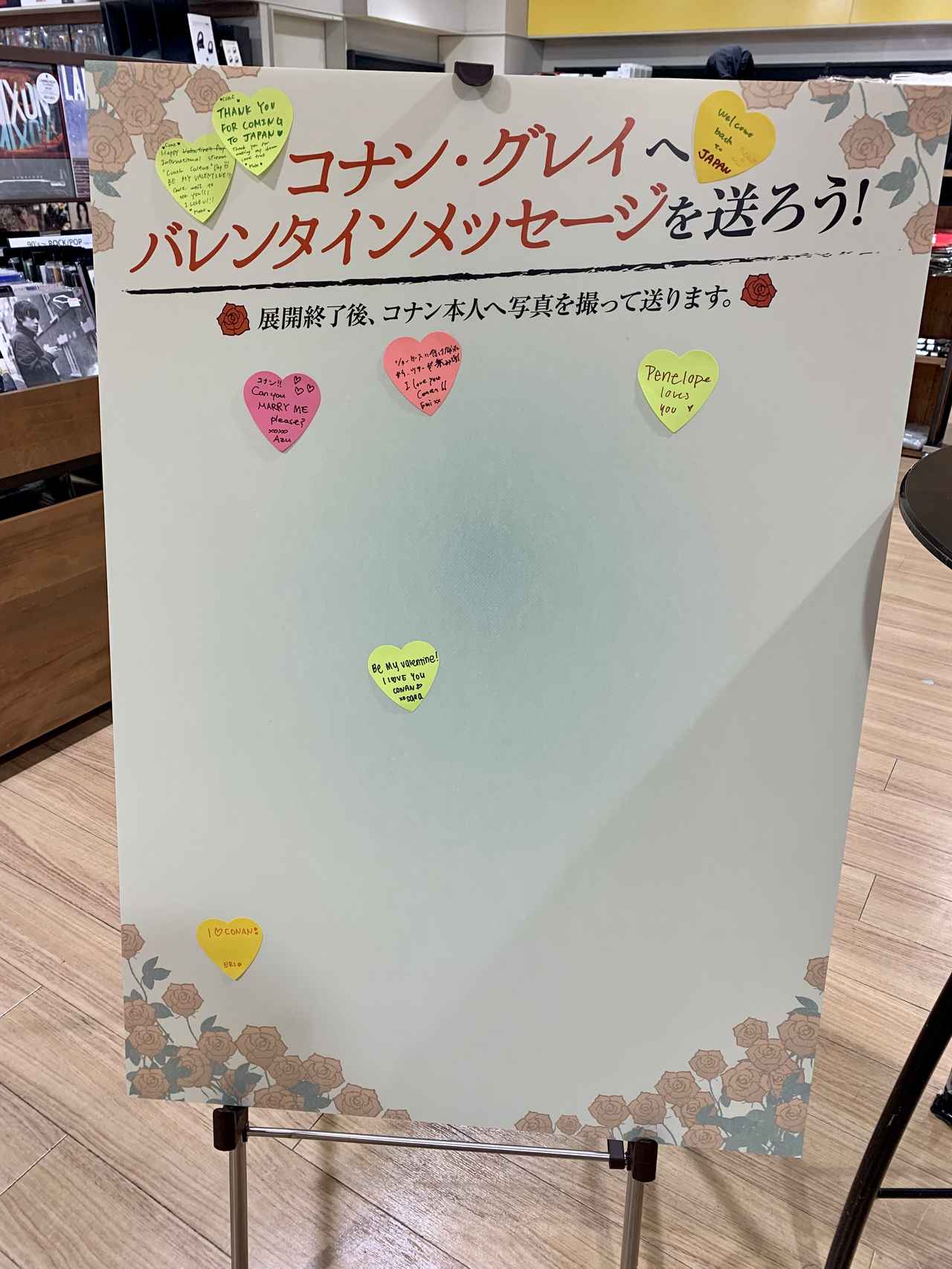2月14日のバレンタイン・デーに大阪で初日を迎えるという、コナンらしいロマンチックなシチュエーションで行なわれる今回の来日公演だが、今回の展示では、バレンタイン・デーに合わせてコナンへのメッセージボードも設置されている。ボードは展示終了後、写真に収めてコナン本人に送られるそうで、コナン本人に直接メッセージを届けられる貴重な機会に。フロントロウ編集部は展示初日のオープン間もない時間に訪れたのだが、すでにファンからのメッセージが貼られていた。