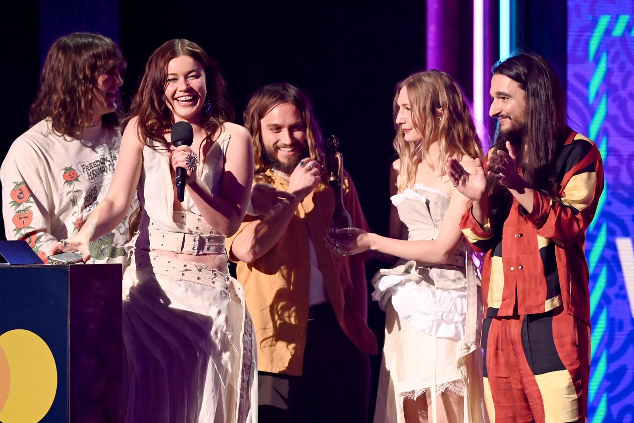 今年のグループ賞を受賞したのは、現在音楽シーンで大注目のウェット・レッグ。ワイト島出身のリアン・ティーズデイルとへスター・チャンバースによるデュオだが、アワードにはツアーメンバーであるヘンリー・ホームズ、ジョシュア・モバラキ、エリス・デュランも一緒に参加。