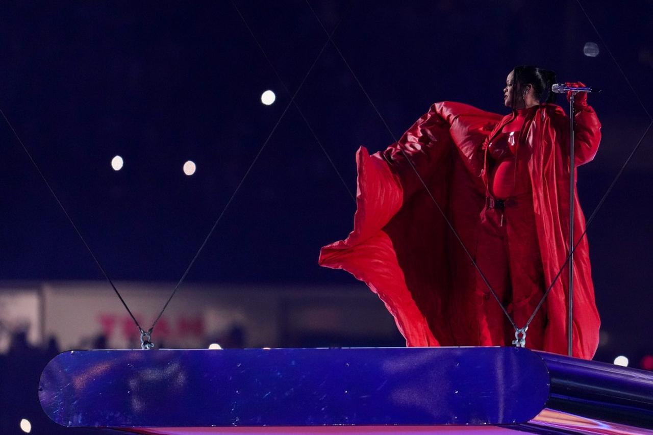 パフォーマンス中は、真っ赤なロエベ(Loewe)のジャンプスーツに、アライア(Alaia)のオーバーサイズのコートに身を包んでいたリアーナに、妊娠のウワサが浮上。というのもリアーナのお腹がふっくらとしていたから。
