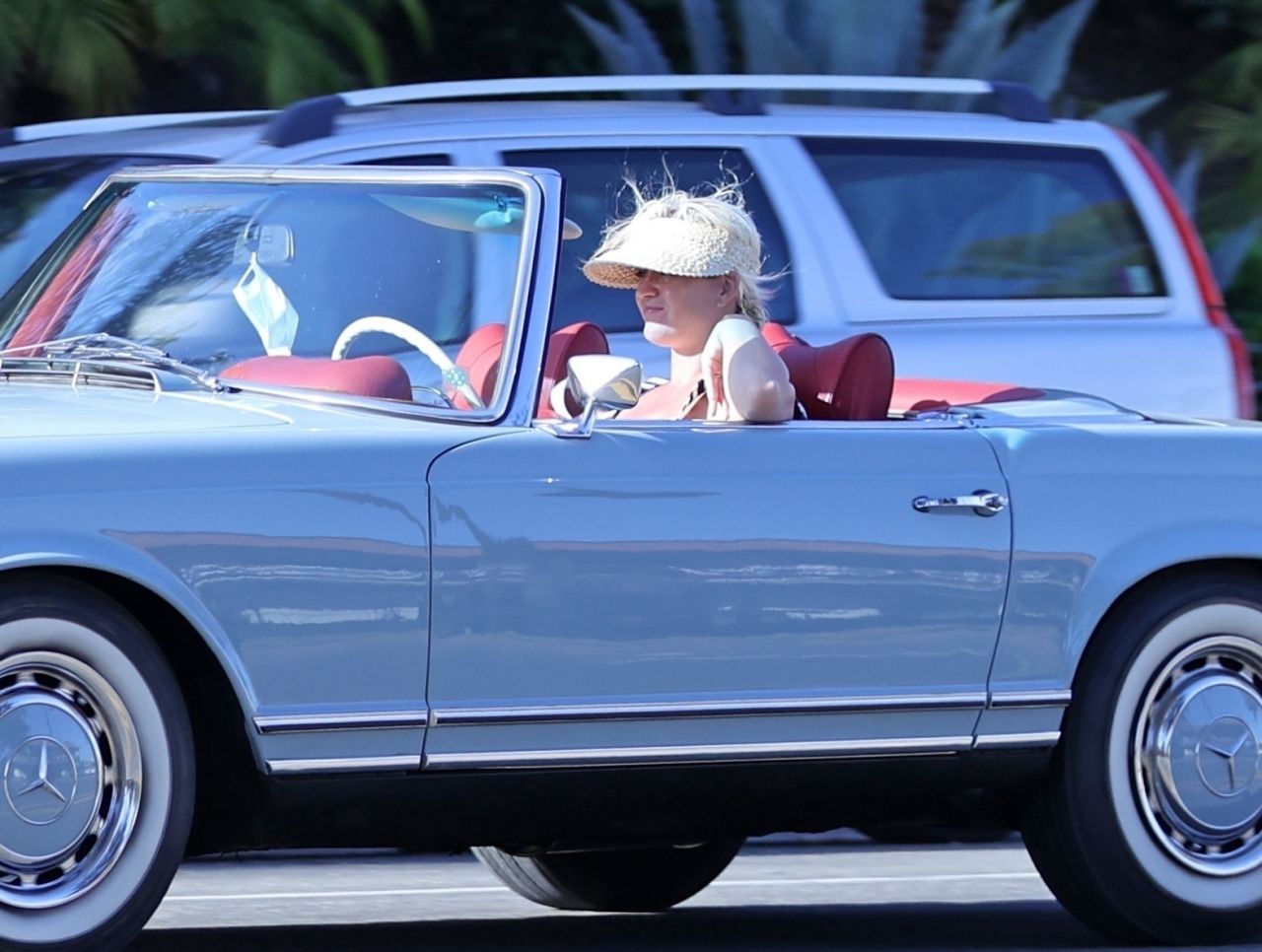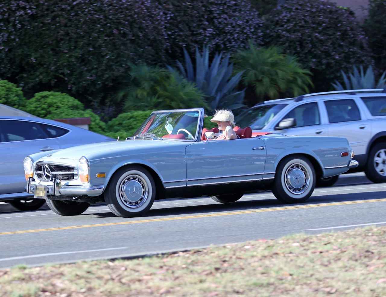 ケイティの愛車の1つは、メルセデス・ベンツの1967年式クーペ。ライトブルーのエクステリアに、レッドのインテリアが目立つオープンカーを運転するケイティをキャッチ。