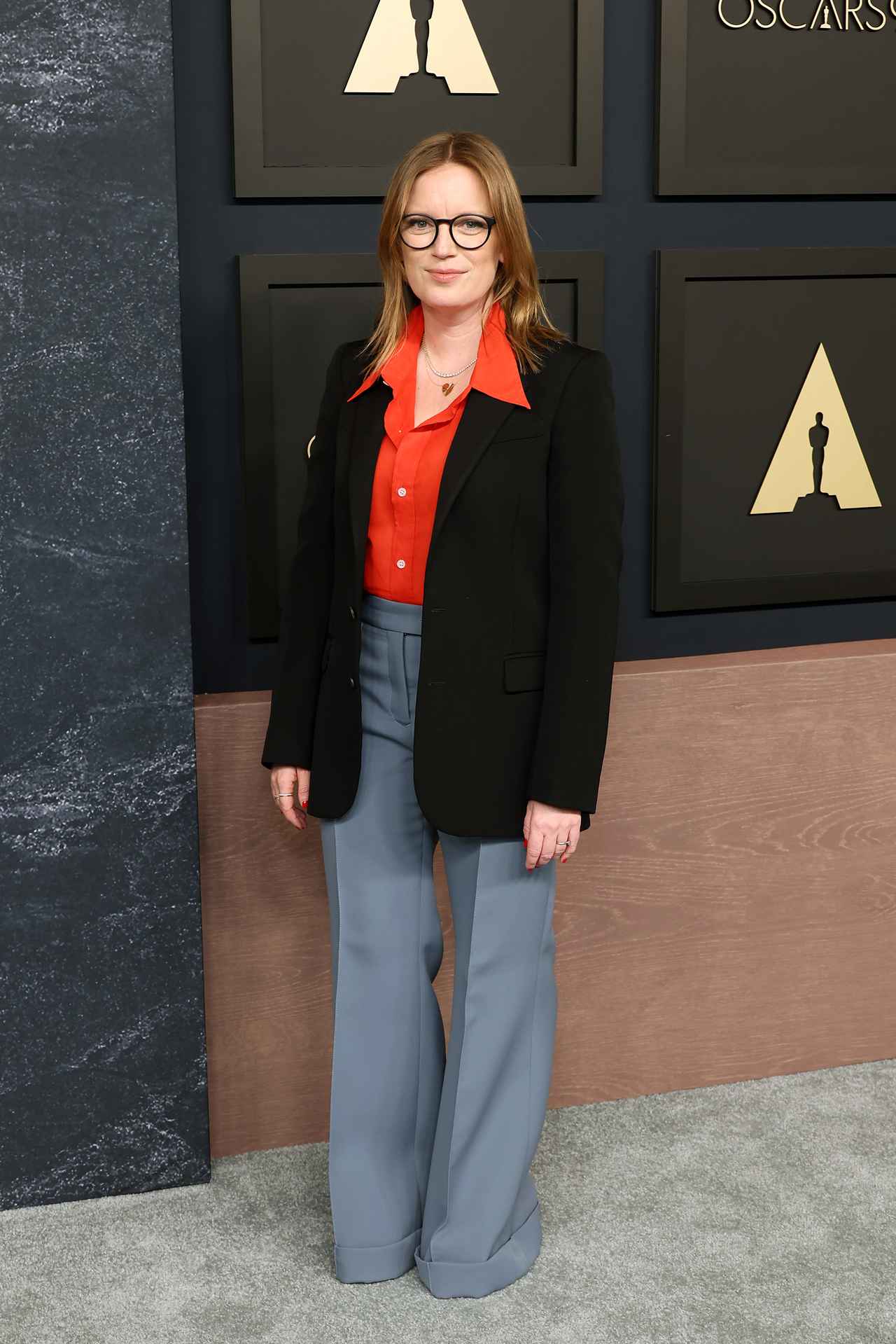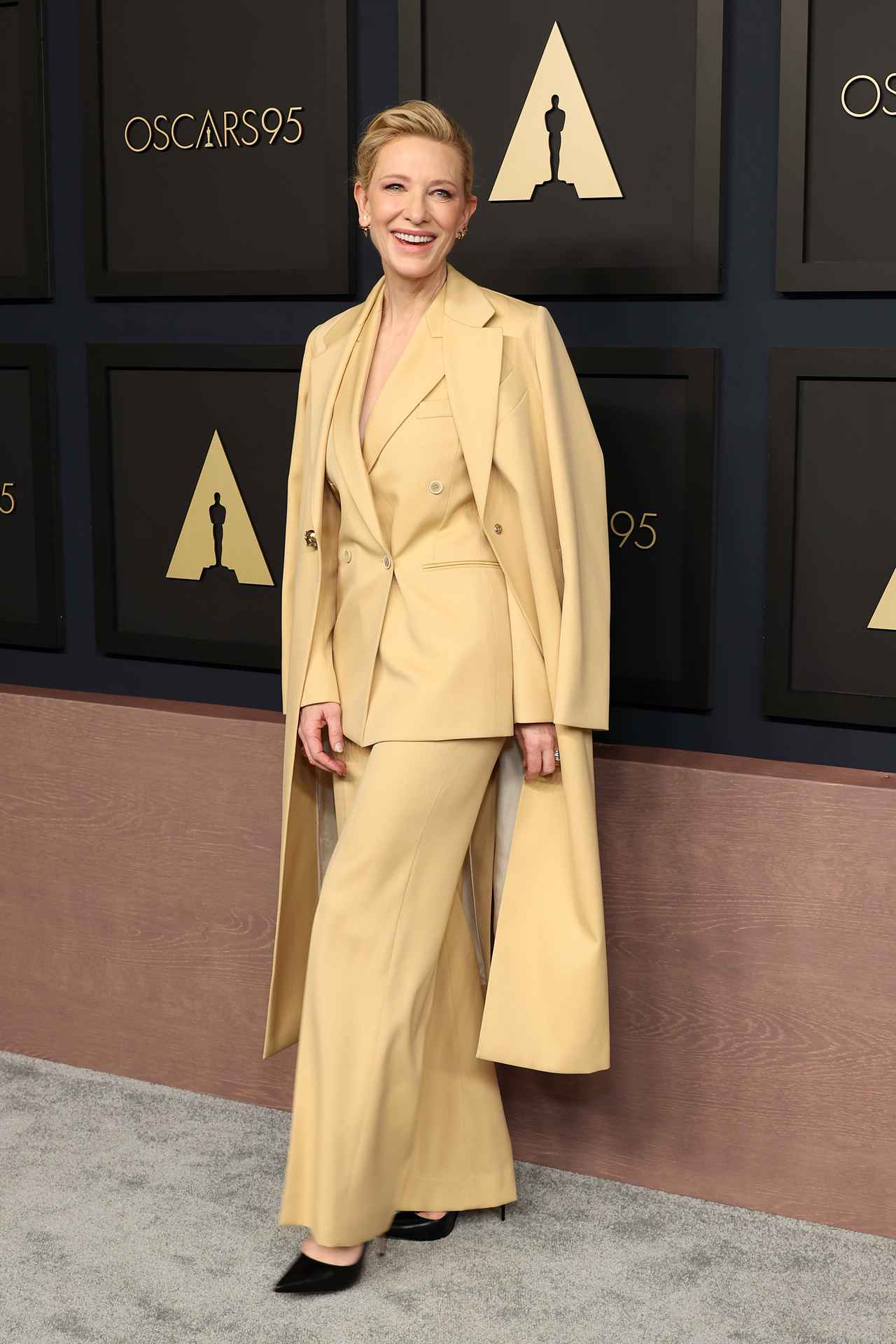 ジェイミーのブルーホワイトなスーツは、上品で素敵。この日はスーツを選んだ女性が多く、『ブラックパンサー/ワカンダ・フォーエバー』でラモンダ王を演じたアンジェラ・バセットは、シャツもパンツもジャケットも、同じストライプ柄で合わせて遊び心のあるスタイル。『TAR/ター』の主演ケイト・ブランシェットは、イエローベージュのセットアップにコートを羽織って、おしゃれでかっこ良くまとめた。『ウーマン・トーキング 私たちの選択』のサラ・ポーリー監督は、オレンジのトップにブルーのパンツというカラフルな装い。ネイルのオレンジ色がトップスとマッチしている。