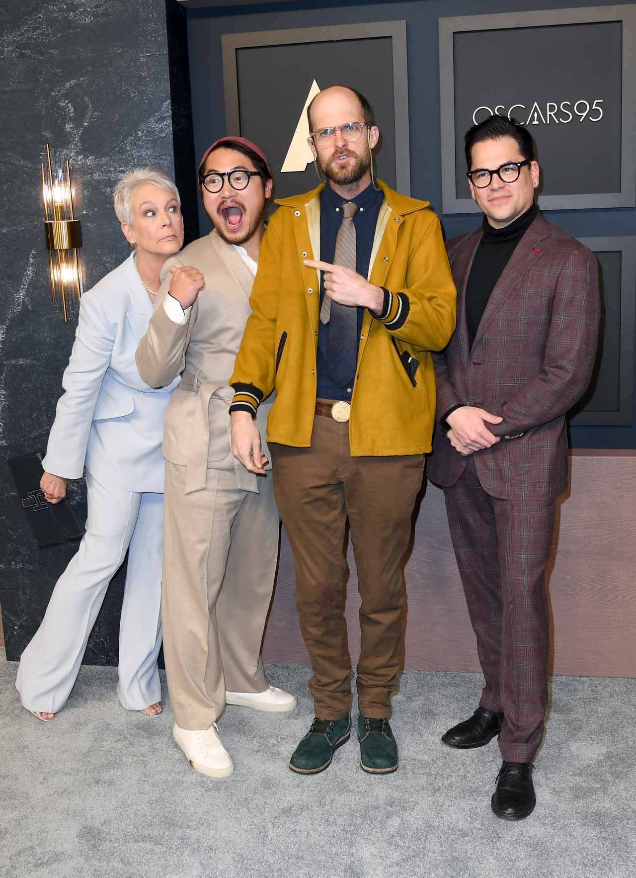 明るく元気なことで知られる『エブエブ』の監督デュオであるダニエルズや、ディアドラ役のジェイミー・リー・カーティスは、彼ららしいノリで写真撮影。それにしても、1番右に立つ映画プロデューサーのジョナサン・ウォンのスーツルックはおしゃれ。