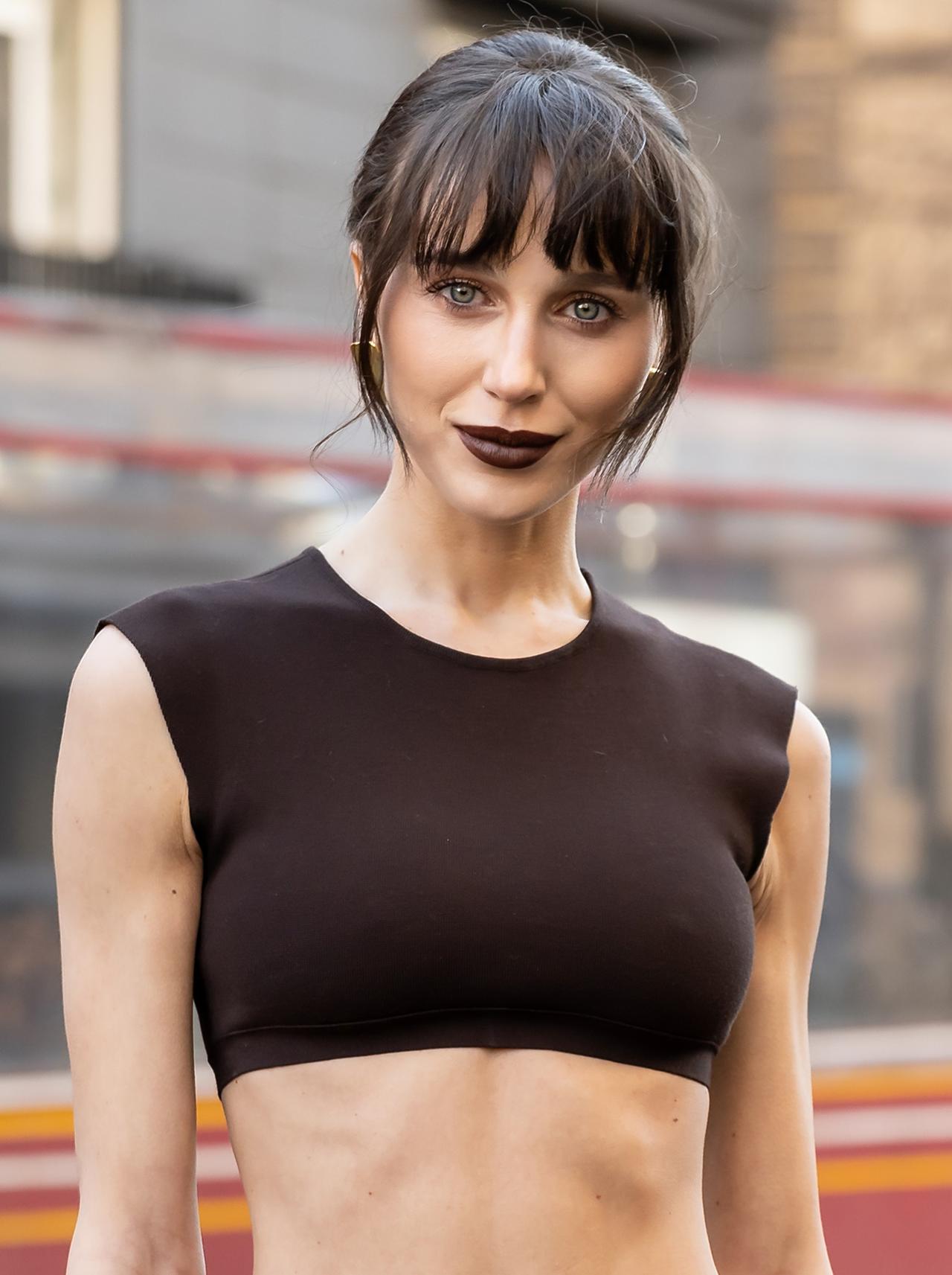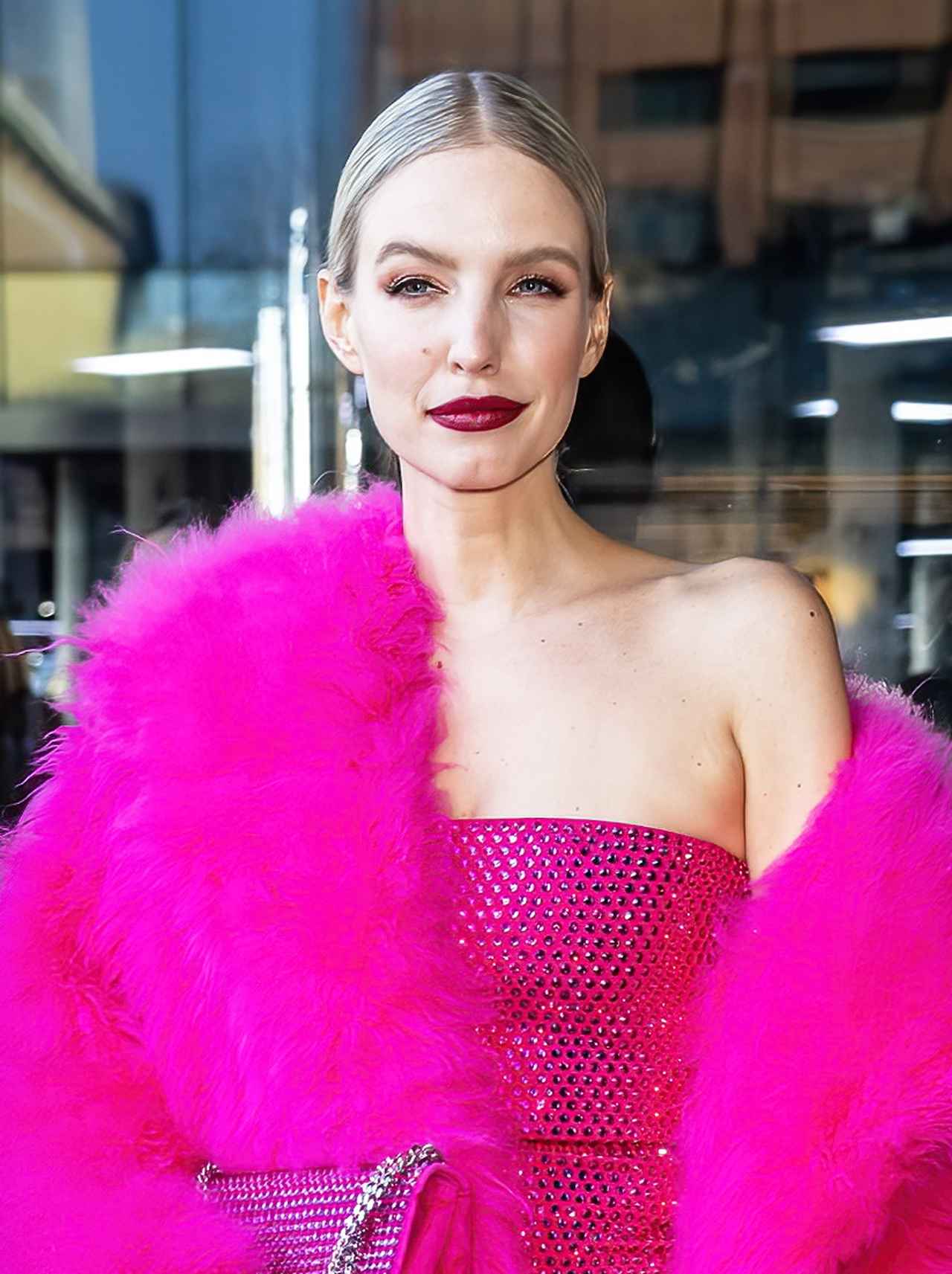 ファッションウィークの常連として知られる人気ファッショニスタのレオニー・ハンネは、ピンクよりのバーガンディカラーのリップを主役にしたメイクでマイケル・コースのコレクションへ。目元にはさりげなくキラキラをのせて、華やかさ抜群のメイクに仕上げた。