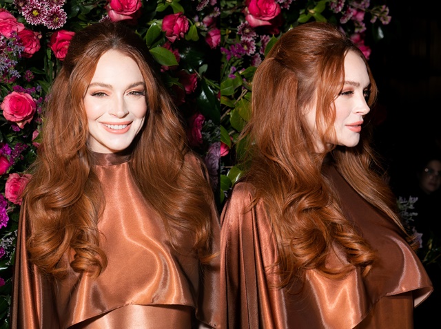トップをふんわり盛ったハーフアップアレンジでクリスチャン・シリアーノ(Christian Siriano)のコレクションに出席したのは、俳優でシンガーのリンジー・ローハン。盛り髪とボリューミーなウェーブを組み合わせてAラインにすることで、ロマンティックなアレンジが完成。