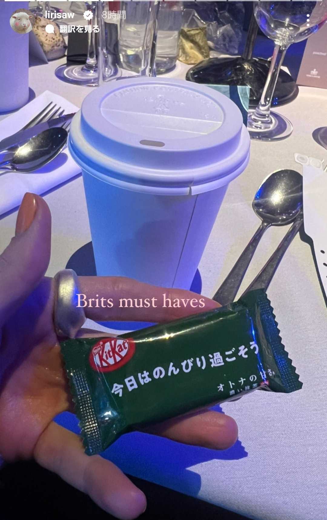 アイリスはこのキットカットを「ブリットの必需品」と紹介し、インスタグラムで公開した。
