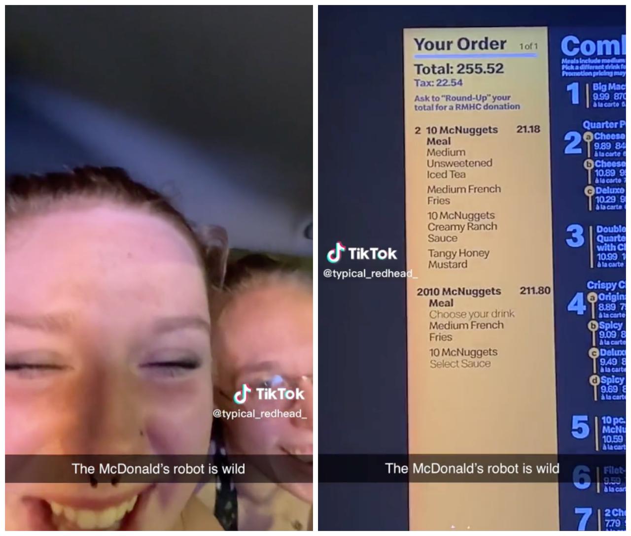 また、別のTikTokユーザー(@typical_redhead_)は、チキンマックナゲットのセットを頼もうとして数を間違えられてしまったようで、画面には「255.52ドル(約3万4,000円)」という超高額な料金が表示されていた。女性と友人は怒るでも呆れるでもなく大爆笑。