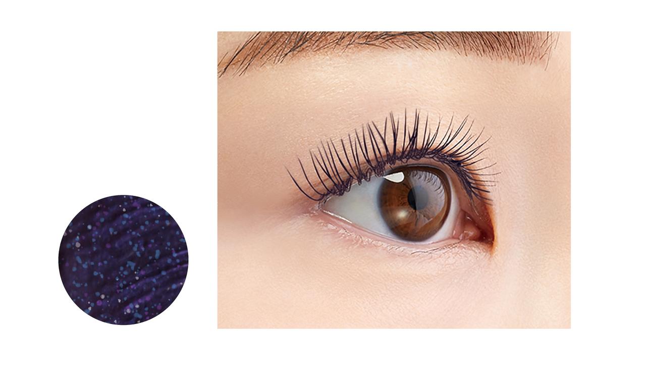 まつげの輪郭をしっかりと引き立てながらも、光の加減で「透明感のある紫」や「青みがかった黒」と、異なる色彩に変化。日中と夜、室内と屋外など、シーンによって“可憐な表情”や“ミステリアスな表情”をかなえる。さらにパールの効果によって、まつげになめらかなツヤ感と立体感も演出してくれる。