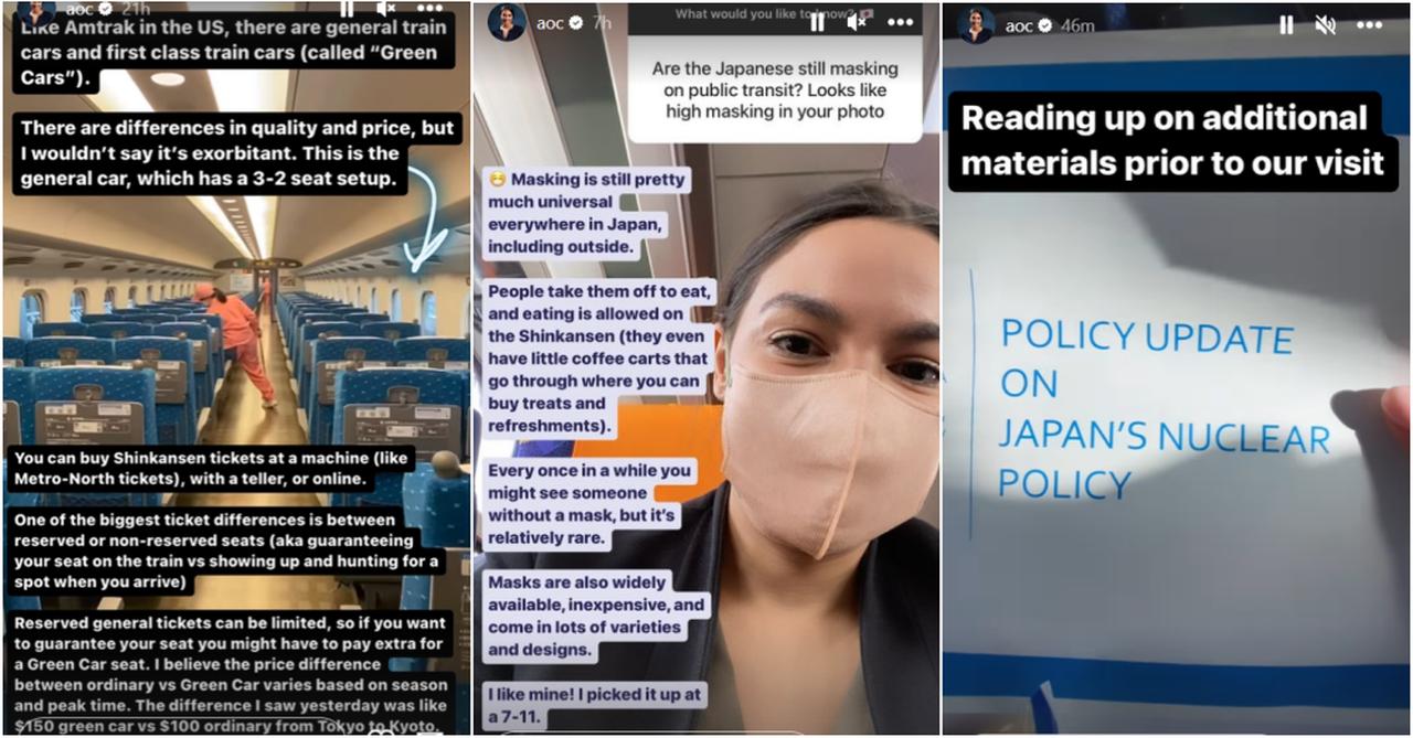しかしAOCにとって、ある場所に行くことは念願だったよう。じつは彼女、大の鉄道オタク! そのため、来日してすぐに受けた研修は、JRの交通網について。東京駅でJRのコントロールセンターなどを見学し、職員から様々な説明を受けたという。インスタグラムで、「新幹線ツアーは、日本に来たかった理由の1つ」とコメントしたAOCは、車内を清掃中のスタッフの様子も記録。日本において電車の清掃員のスキルが高いことは世界的に有名で、彼女も感心したよう。