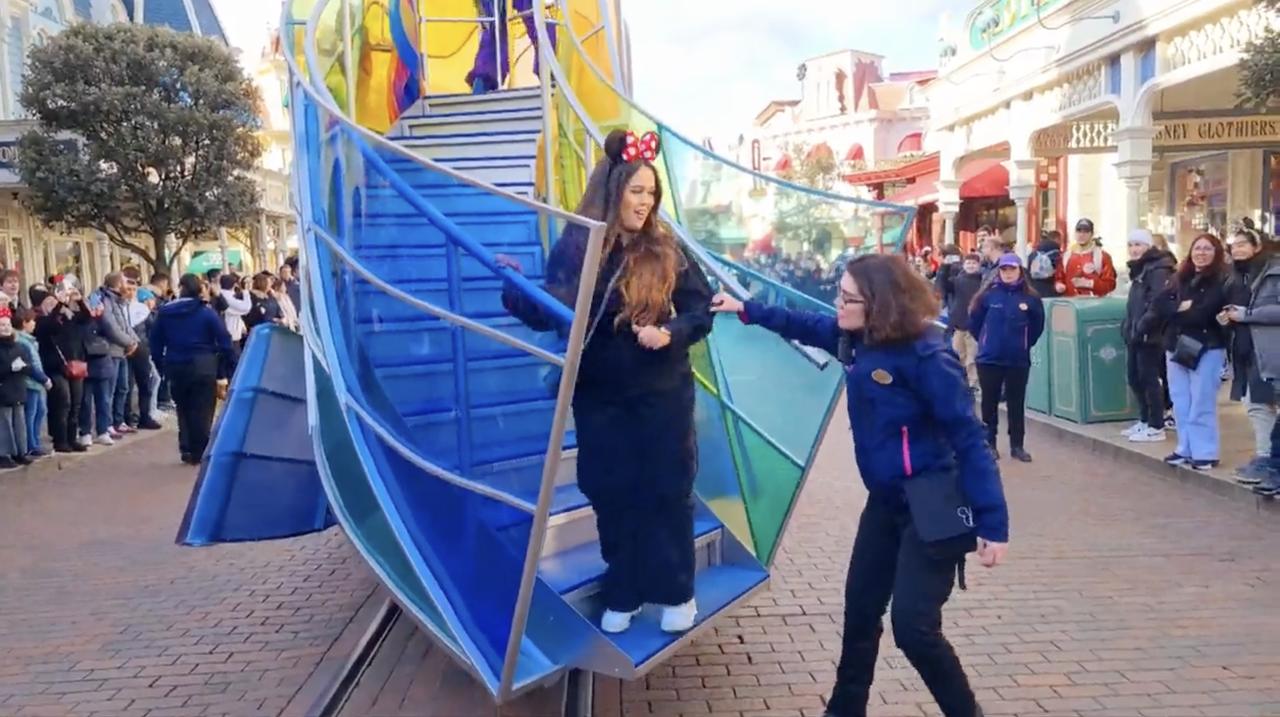 フランスのディズニーランド・パリで、走行中のパレードのフロートに乗り込んだゲストの女性が、近くにいたキャストに強制的にフロートから降ろされて、パレードの列の外に連れて行かれるハプニングがあった。