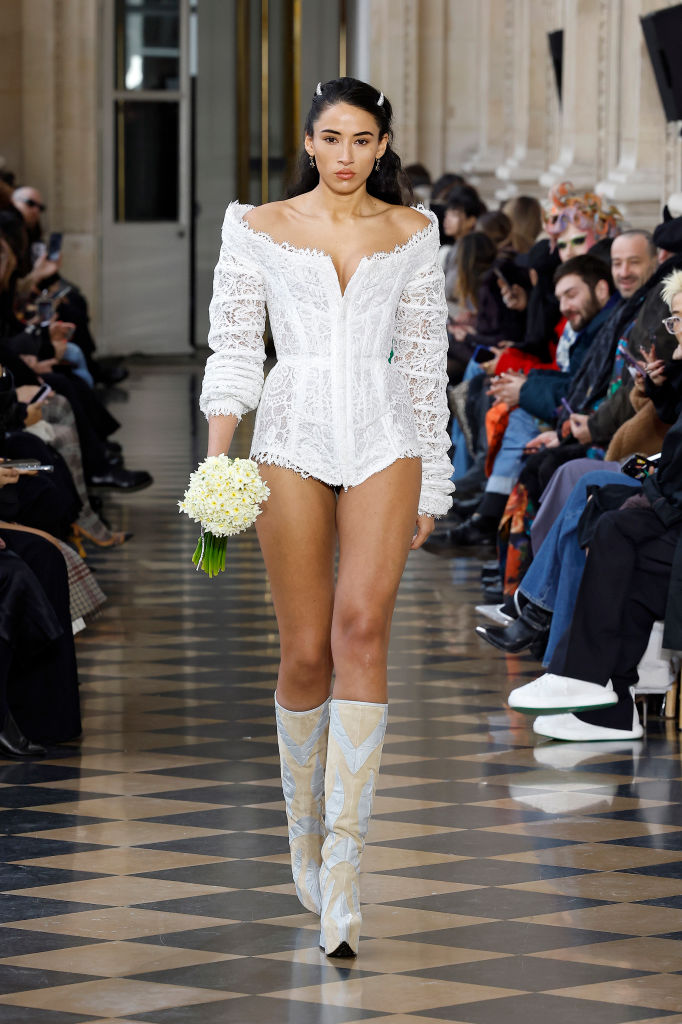 そしてこのショーのフィナーレでは、ヴィヴィアンの孫であるコーラ・コーレが務め、コルセット風のウェディングドレスを着用してランウェイを歩いた。