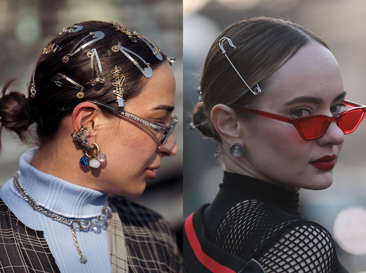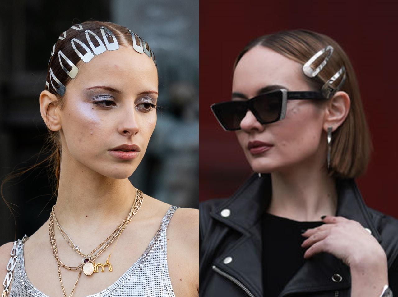 コペンハーゲン・ファッションウィークに続いてパリ・ファッションウィークでも人気を集めたのは、シルバーのメタルっぽい素材のヘアアクセを取り入れたアレンジ。スリーピン(パッチン留め)を大量使いしたり、安全ピン風のヘアアクセを取り入れたりとエッジの効いたアレンジが目立った。
