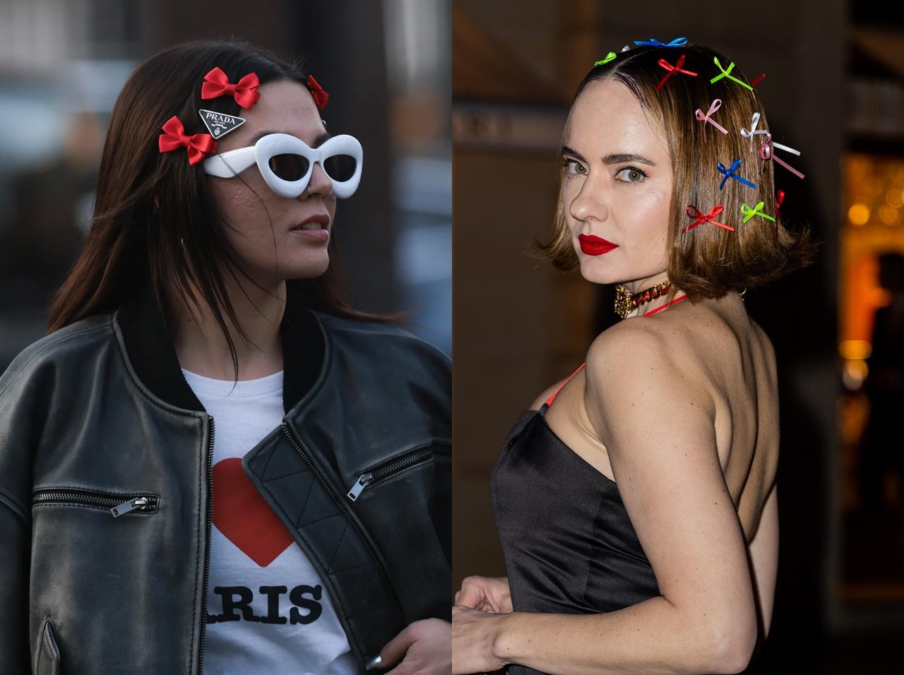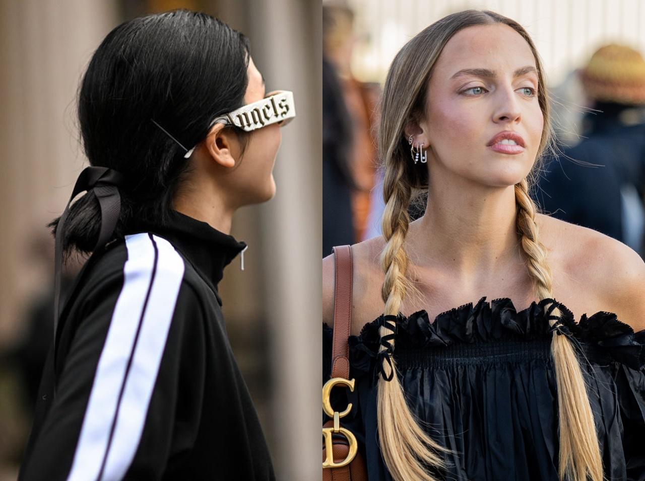 SNSでもトレンド入りしているリボンヘアアレンジは、パリ・ファッションウィークでも大人気。カラフルなリボンをたっぷり使ったアレンジをはじめ、三つ編みやお団子と合わせたバレエコア風のアレンジも多くキャッチされた。