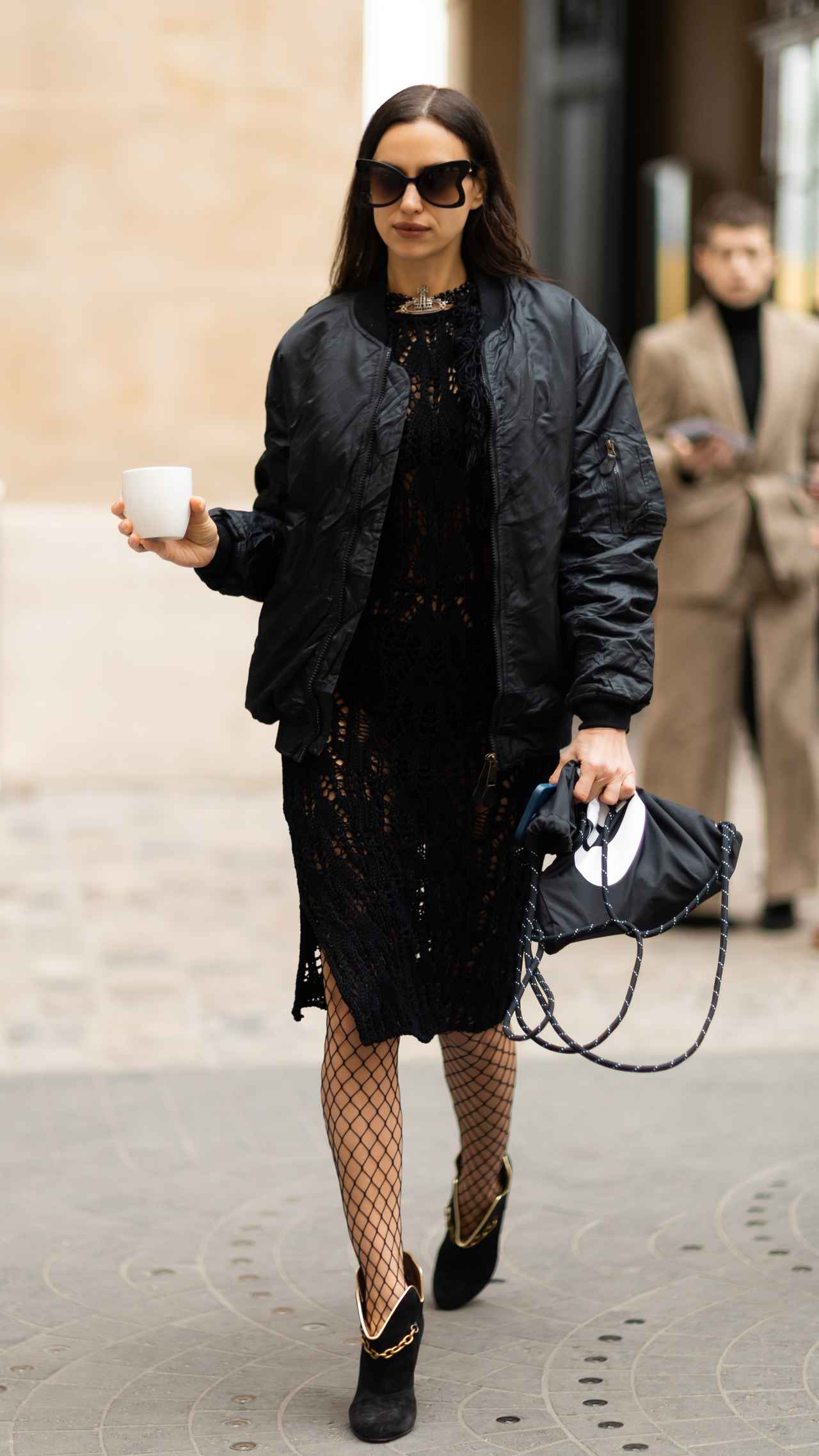 ファッションウィークでは様々なブランドのランウェイを歩いたイリーナ・シェイクは、オールブラックコーデでパリの街に登場。オールブラックコーデといっても、この日のイリーナはクロッシェ編みのワンピースに網タイツを合わせたフェティッシュなスタイリング。