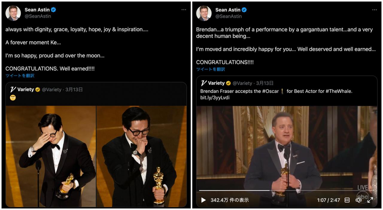 なお、マイキー役のショーンは、この日、助演男優賞を受賞したキーと主演男優賞を受賞したブレンダン・フレイザーの両者と1992年公開の映画『原始のマン』で共演していることから、ひときわ感慨深かったようで、「つねに威厳、気品、忠誠心、希望、喜び、感動を持っている。キーにとって永遠の瞬間。嬉しいし、誇らしいし、天にも昇る心地だ。おめでとう!よくやった!」、「ブレンダン…。計り知れない才能を持つとても思いやりのある人間によるパフォーマンスの勝利。感動したし、最高に嬉しい。(この賞に)ふさわしいし、自分の力で勝ち取った。おめでとう!」とツイッターに祝福のメッセージを投稿している。