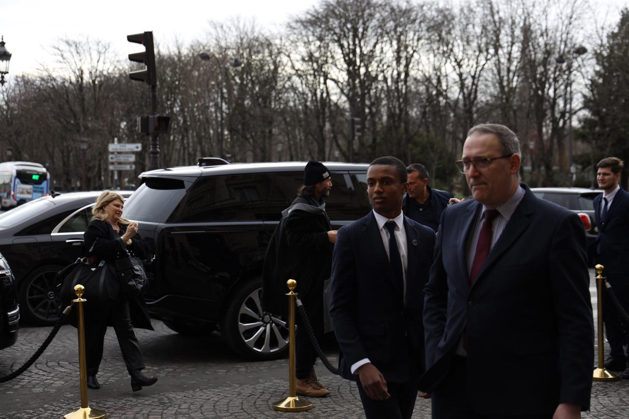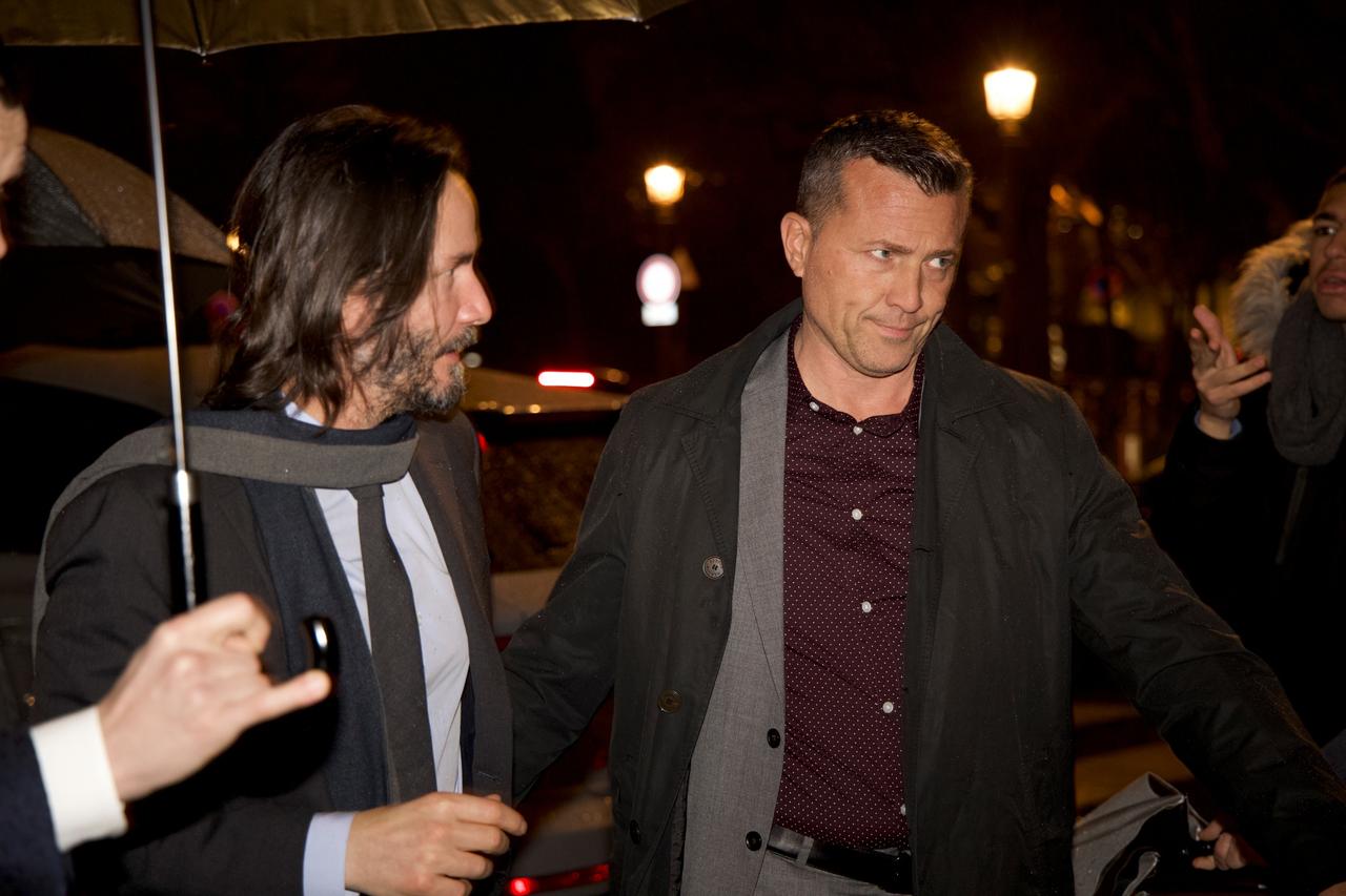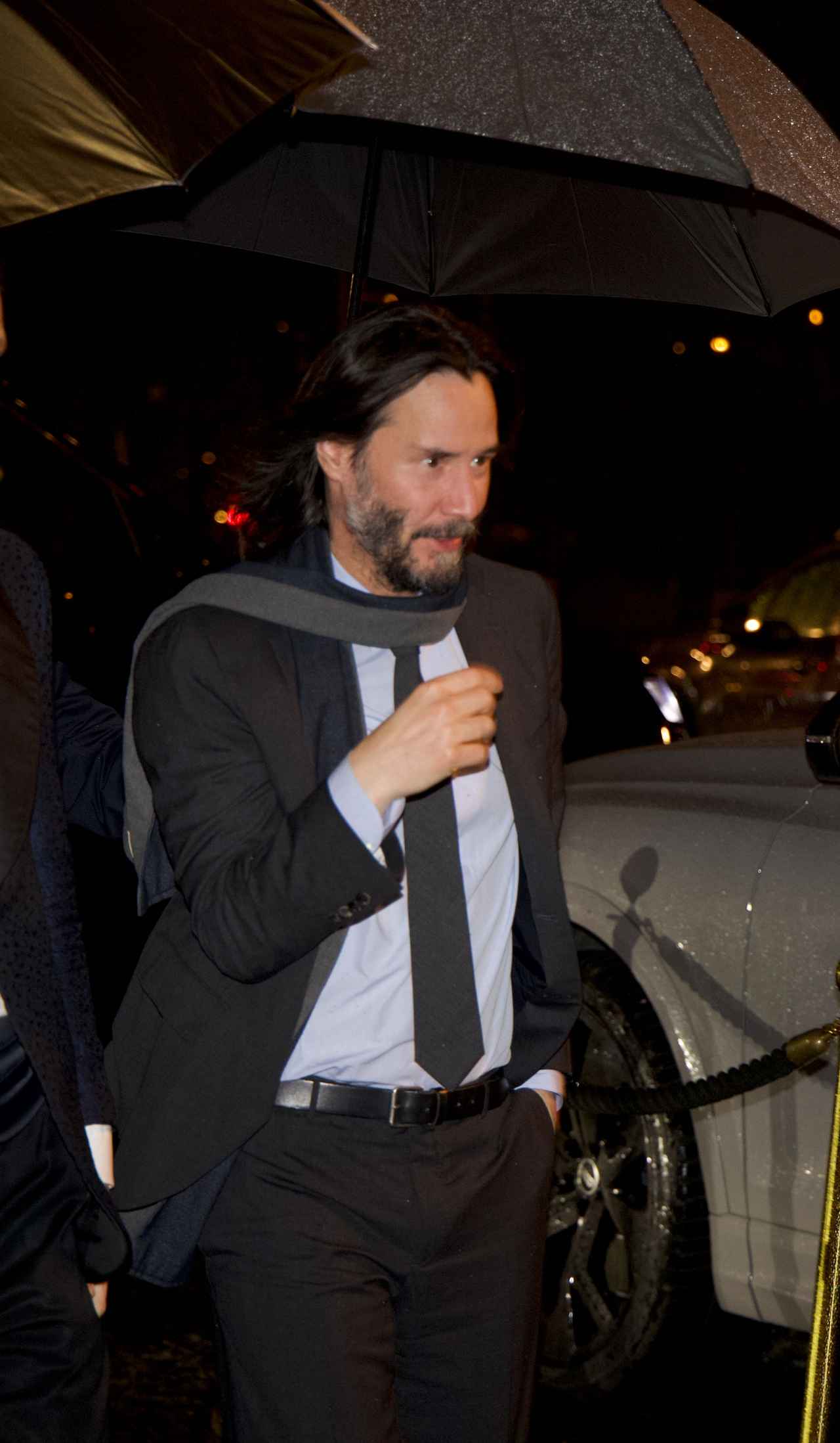 出かけるために、滞在先の超高級ホテルThe Hotel Du Crillonから出てきたキアヌ。キアヌの関係者やホテル関係者の多くが彼の周りを囲み、さらにあいにくの雨だったため、集まったファンとの交流は実現しなかった。