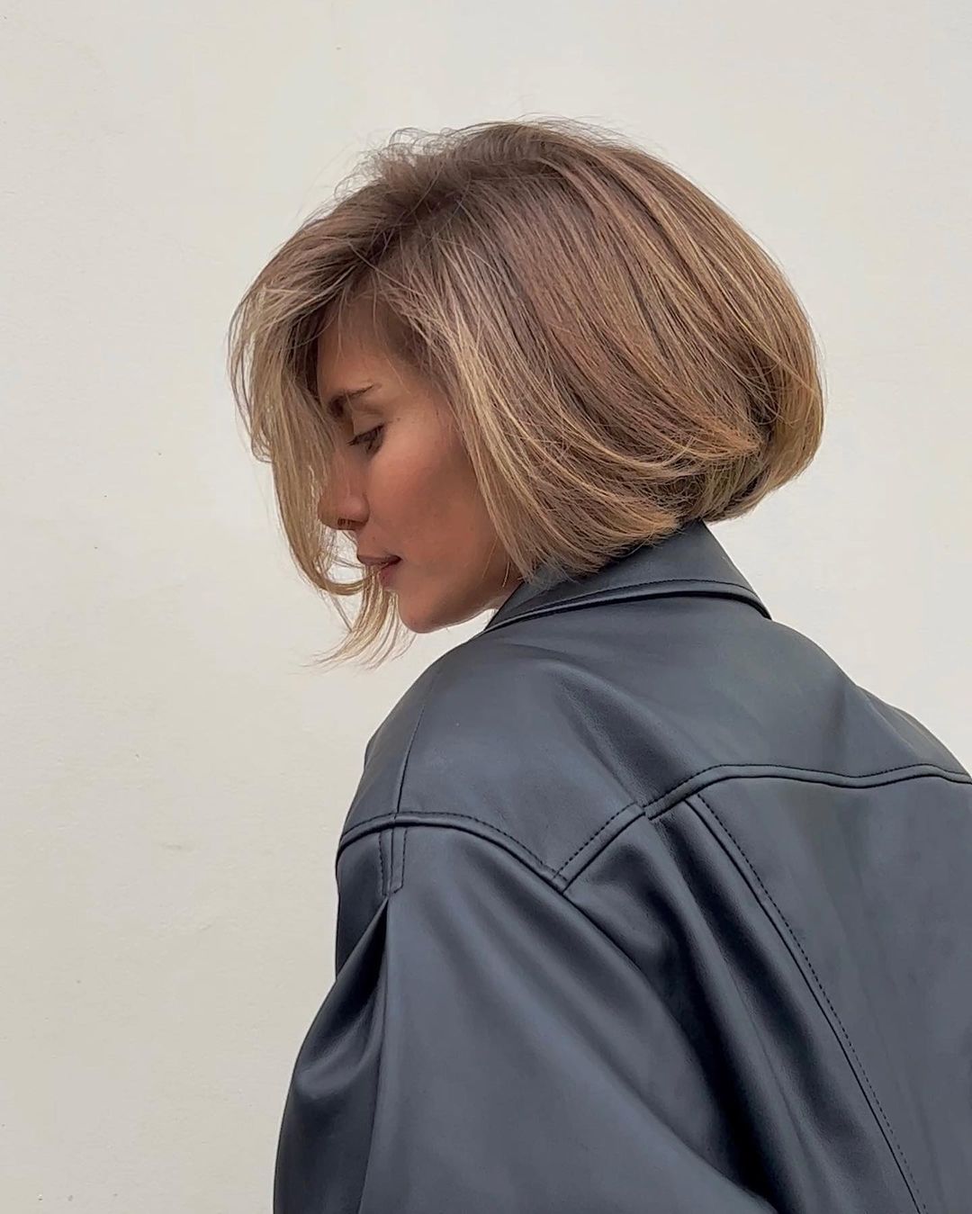 丸みのあるボブヘアは、前髪を後ろに流したかきあげバングとも好相性。小顔効果をキープしながら、ふわりとこなれ感のある大人な雰囲気を演出してくれる。ヘアバームやオイルを使うと今っぽいツヤ感が出るのでオススメ。