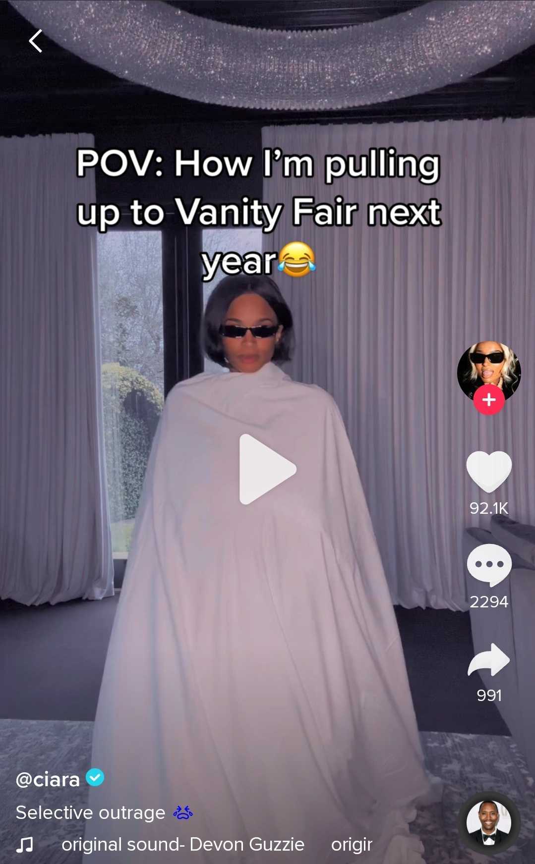 シアラはTikTokに、「来年のVanity Fair主催のアフターパーティーにはこうやって登場する」というコメントつきで、真っ白のシーツで全身を覆った状態で歩く姿を投稿。肌を出すなとうるさいから来年は全身を隠していく、という皮肉でカウンターした。