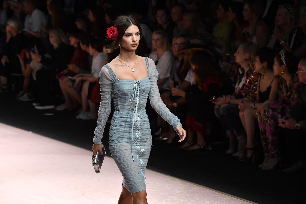 2019年のミラノ・ファッションウィークにて、ドルチェ&ガッバーナ(Dolce & Gabbana)の春夏コレクションのランウェイを歩いたエミリー。