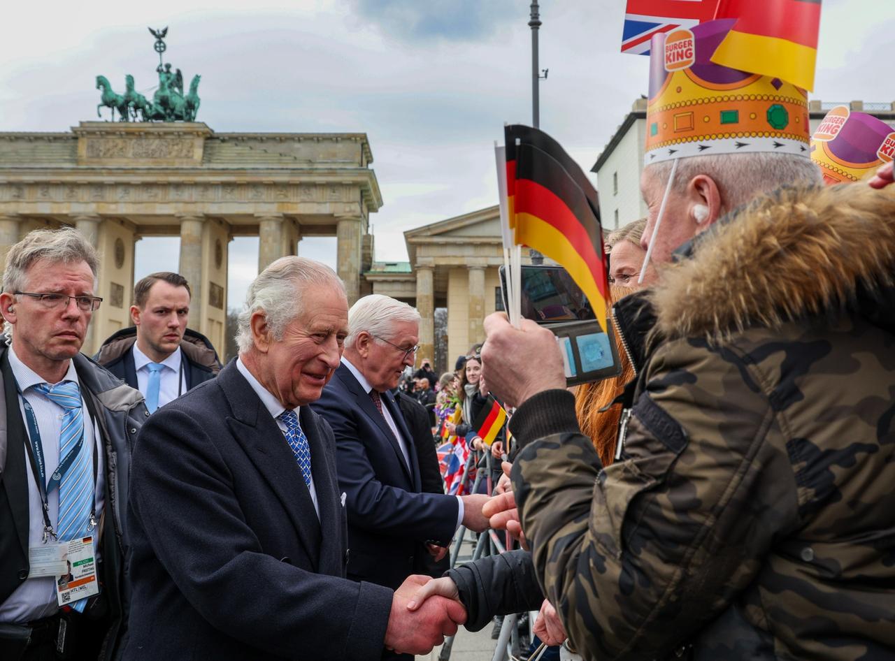 ドイツに到着後、首都ベルリンのブランデンブルグ門でフランク=ヴァルター・シュタインマイヤー大統領とエルケ・ビューデンベンダー大統領夫人に出迎えられたチャールズ国王とカミラ王妃は、夫妻をひと目見ようと集まった大勢の人たちと握手をしたり、軽く言葉を交わしたりするなどして歓迎に応えた。