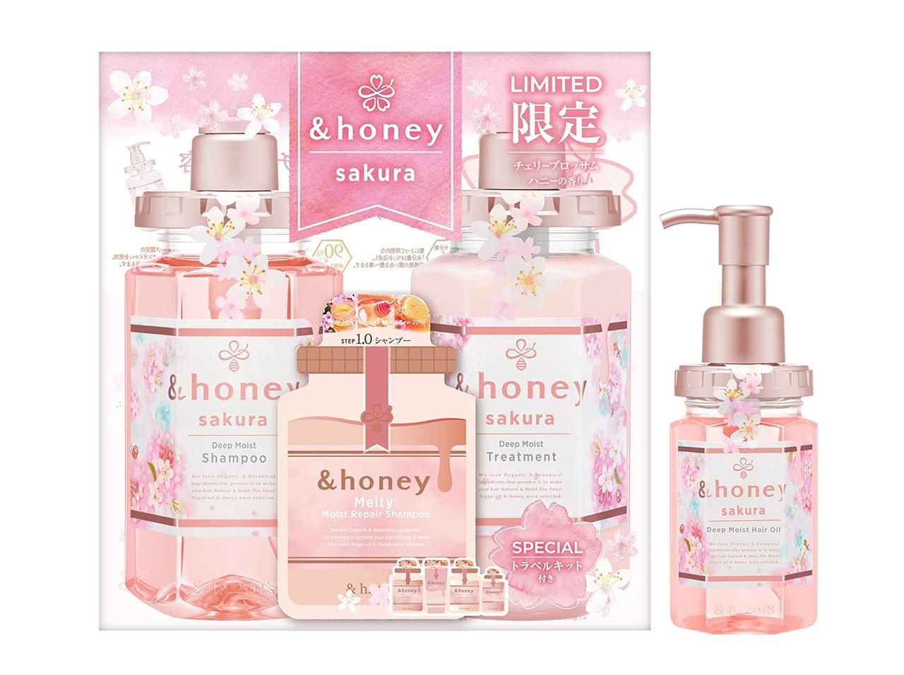 ハチミツをはじめとする保水成分にこだわったオーガニックヘアケア製品を展開するブランドであるアンドハニー(&honey)の期間限定セット。シャンプー、トリートメント、ヘアオイルなどが入ったセットで、チェリーブロッサムハニーの香り。