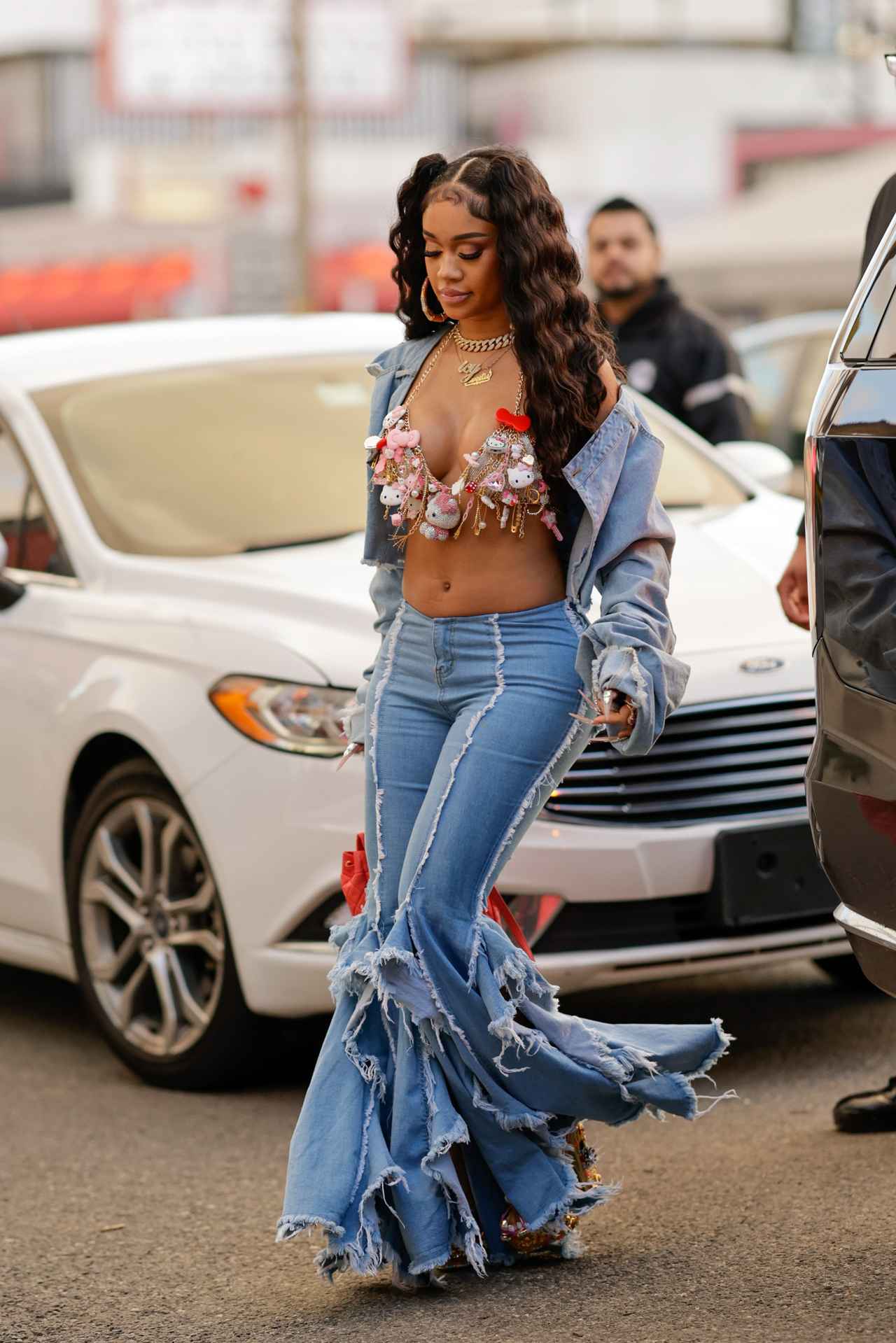 ラッパーとしてだけでなく実業家としても知られるスウィーティーは、大のサンリオ好き。そのため、ロサンゼルスで目撃されたこの日は、ハローキティのブリンブリンやキーホルダーなどがぶら下がったブラをメインにコーデを組んだ。