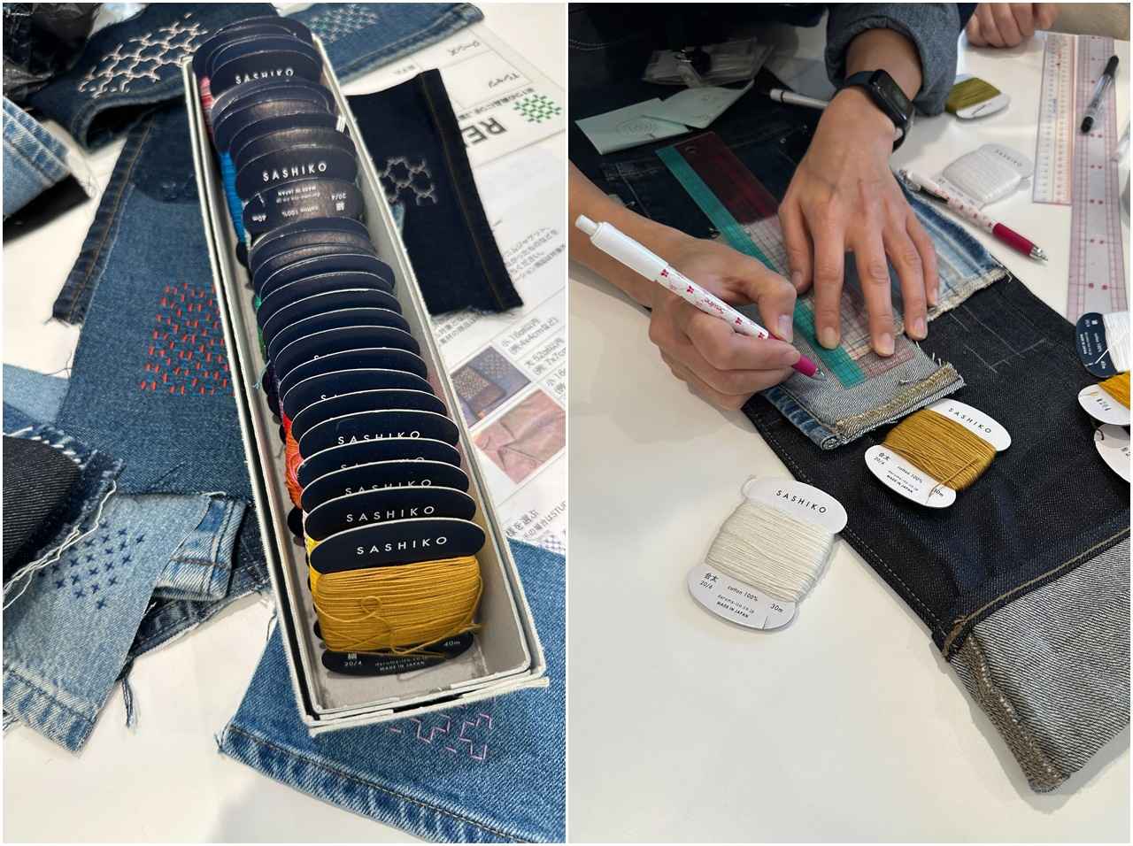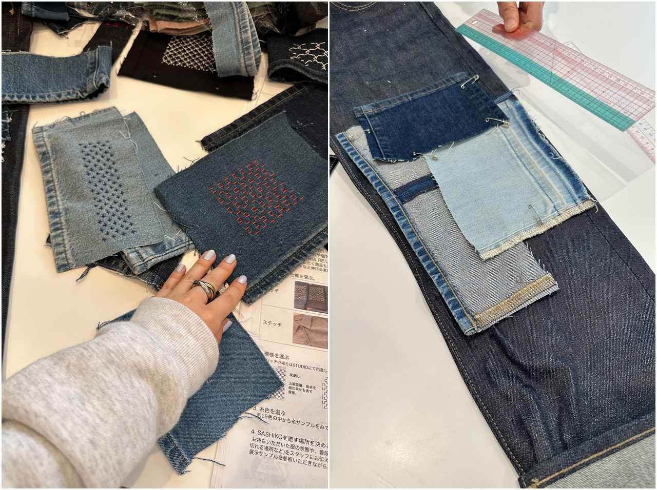 オーダーでは、スタッフさんにイメージを細かく相談し、色味の異なるデニムをミックスするパッチと、新たに「SASHIKO」のメニューに加わった「並縫い」を組み合わせてみることが決定。