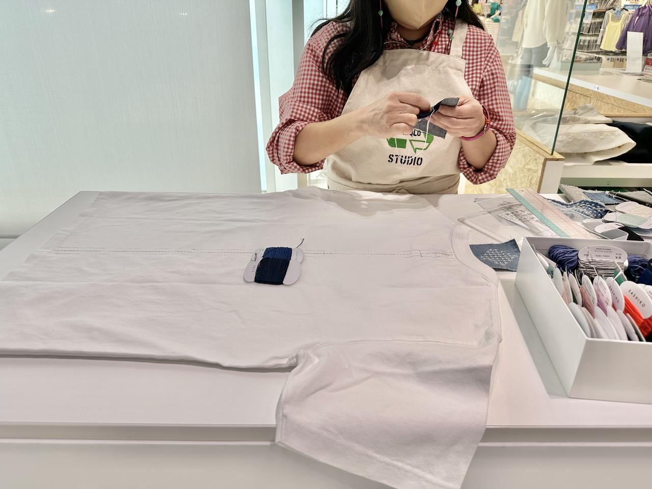 そしてリメイクでは、手持ちのユニクロ製品を新しいアイテムに作り替えたり、自分好みにカスタマイズしたりできる。メニューの詳細はというと、幾何学模様の刺繍を施す日本の伝統的な刺繍“刺し子”をパッチや生地に入れる「SASHIKO」や、テンプレートから選ぶだけでなくオリジナルもつくれる「刺繍」がある。さらに4月から、「SASHIKO」のメニューに新たに「並縫い」が仲間入り。