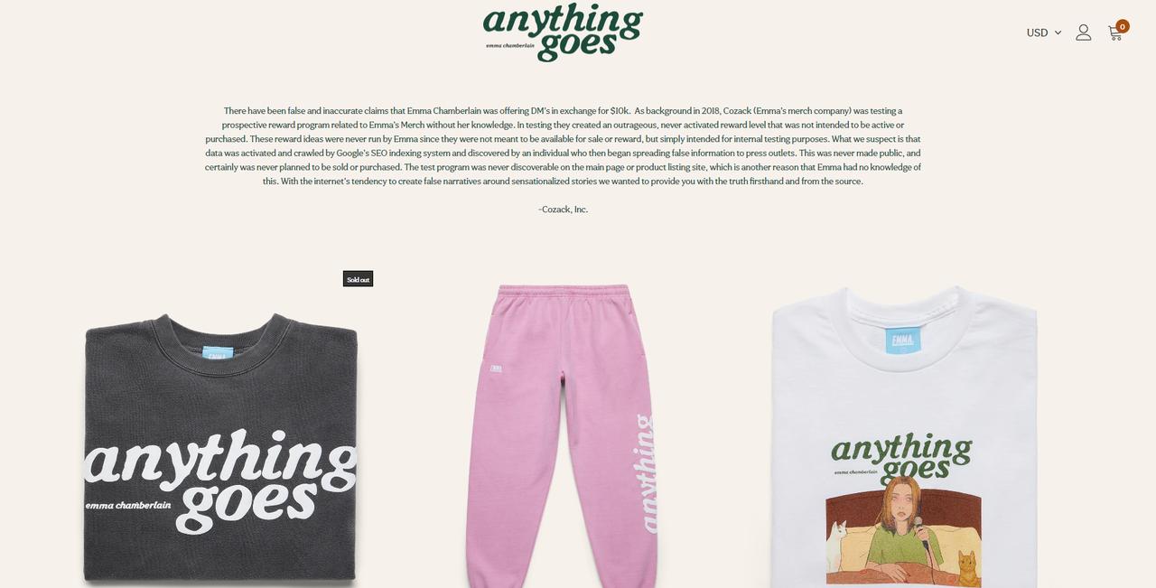 「数日前から、なぜ私がDMを1万ドルで売っているのか、というコメントを見かけるようになりました。私は1万ドルどころか、どんな金額でもDMを売ると言ったことはなかったので、これはオンライン詐欺だと思いました」と語るエマ。自身のグッズ販売会社である Cozackにも連絡を取り、原因について調べたという。