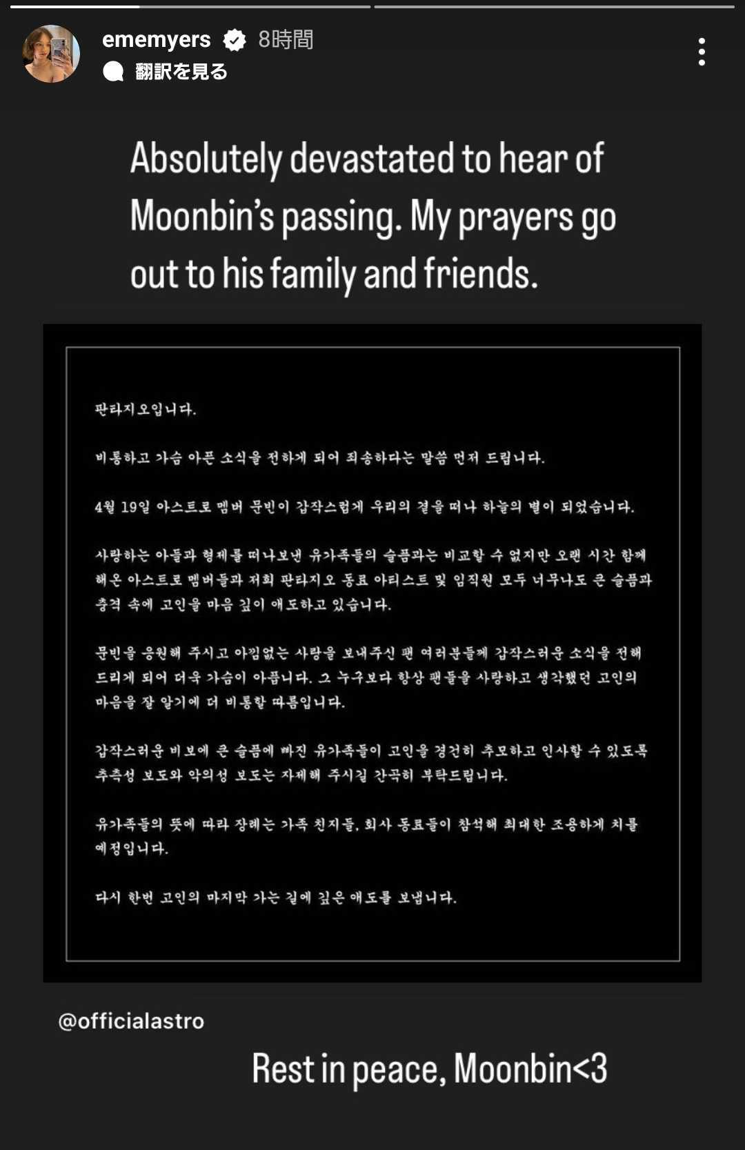エマは、ASTROの公式インスタグラムでASTROの所属事務所ファンジオが発表したムンビンの死去についての投稿を自身のインスタグラムのストーリーズにアップし、「ムンビンが亡くなったと聞いて、とてもショックを受けています。彼のご家族とご友人のために祈りを捧げます。安らかに眠ってください、ムンビン」とメッセージを添えて追悼した。