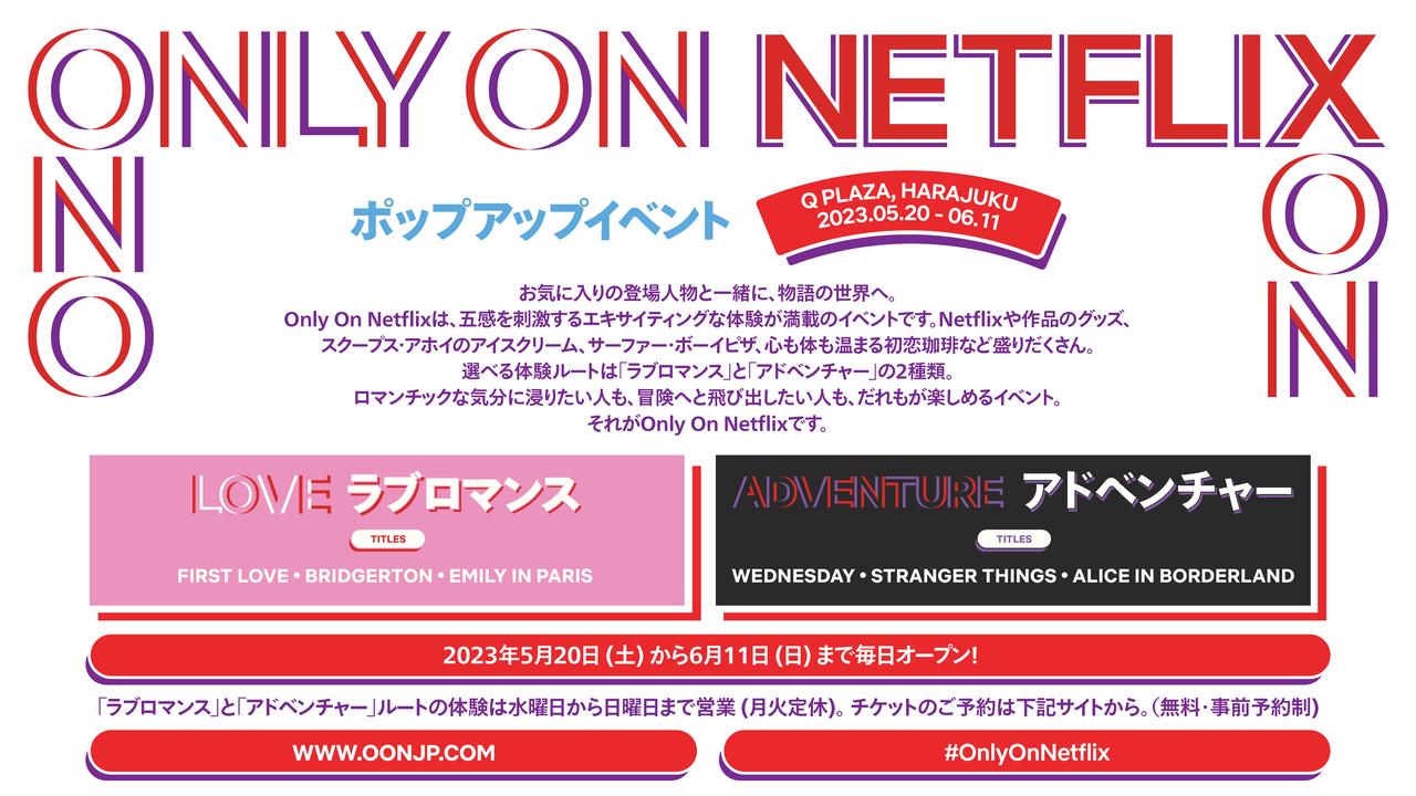 Netflixは、人気作品の数々を体験できるアジア初のポップアップイベント「Only On Netflix」を、2023年5月20日(土)から6月11日(日) までの期間限定にてキュープラザ原宿で開催する。