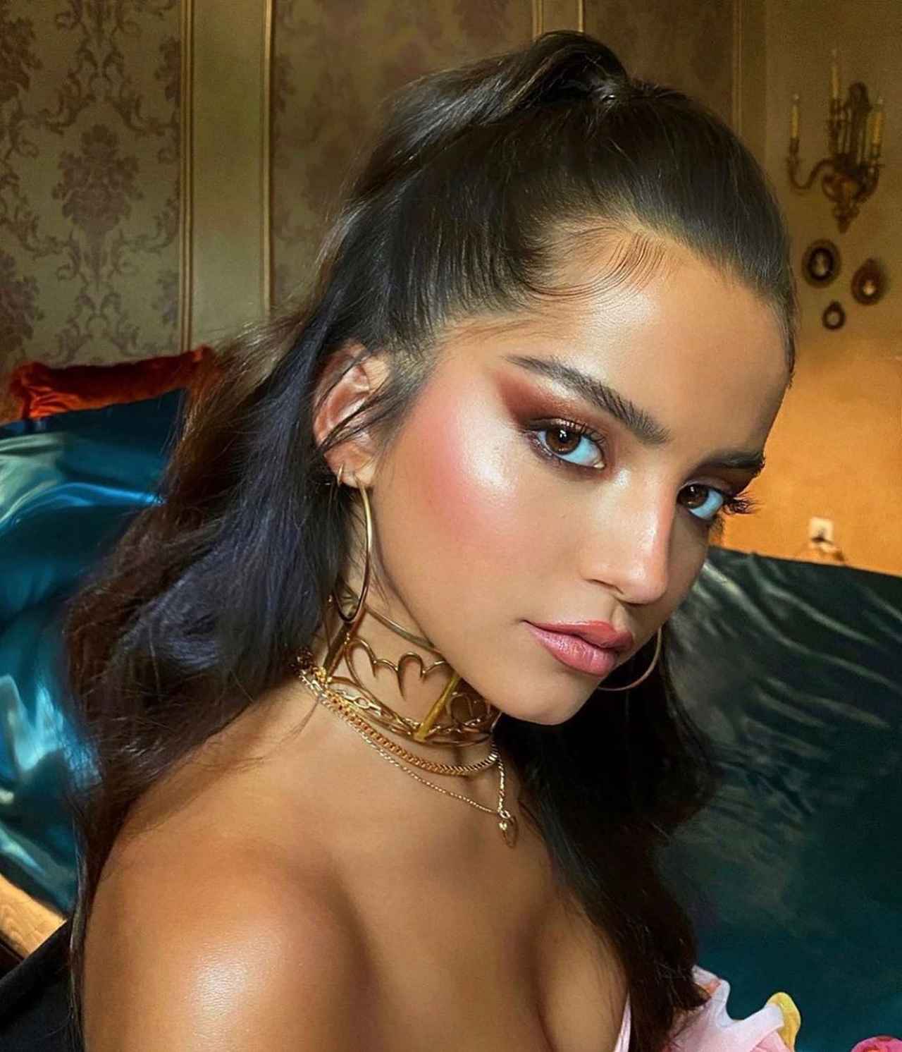 俳優のイザベラ・メルセードは、サイドをすっきりまとめたハーフアップをチョイス。顔周りが寂しく見える前髪なしハーフアップは、産毛をアレンジしてメリハリを出して。