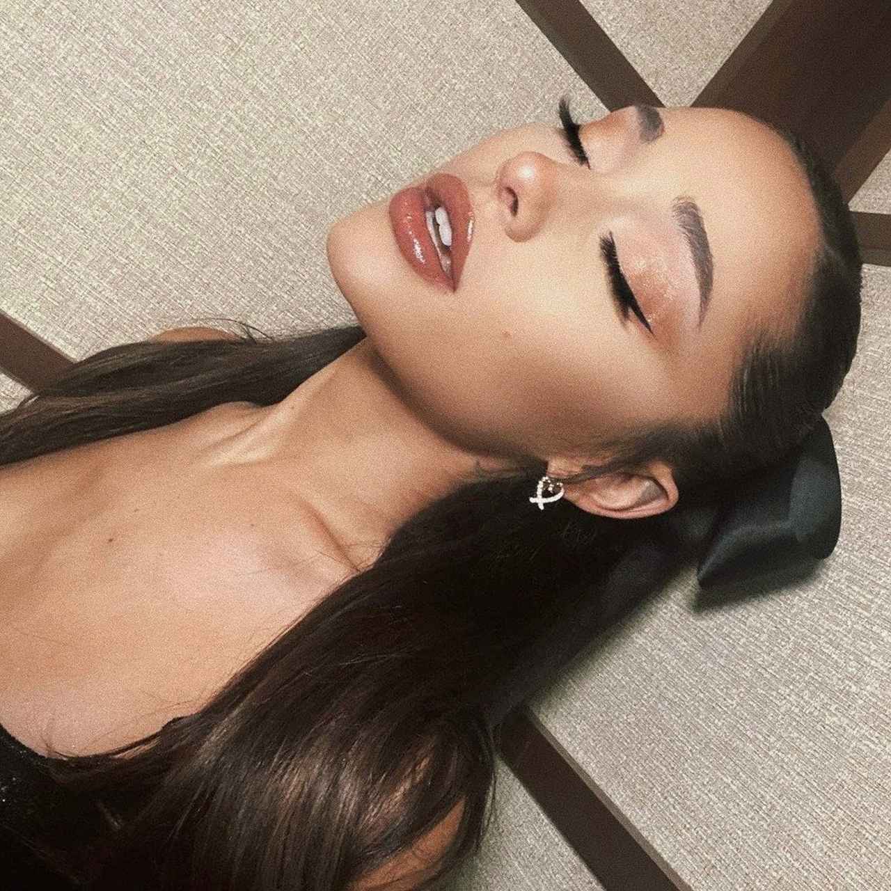 シンガーのアリアナ・グランデは、結び目に大きなリボンをつけたハーフアップアレンジに挑戦。おくれ毛を出さず顔周りをすっきりさせることで、甘すぎず大人っぽい印象に。