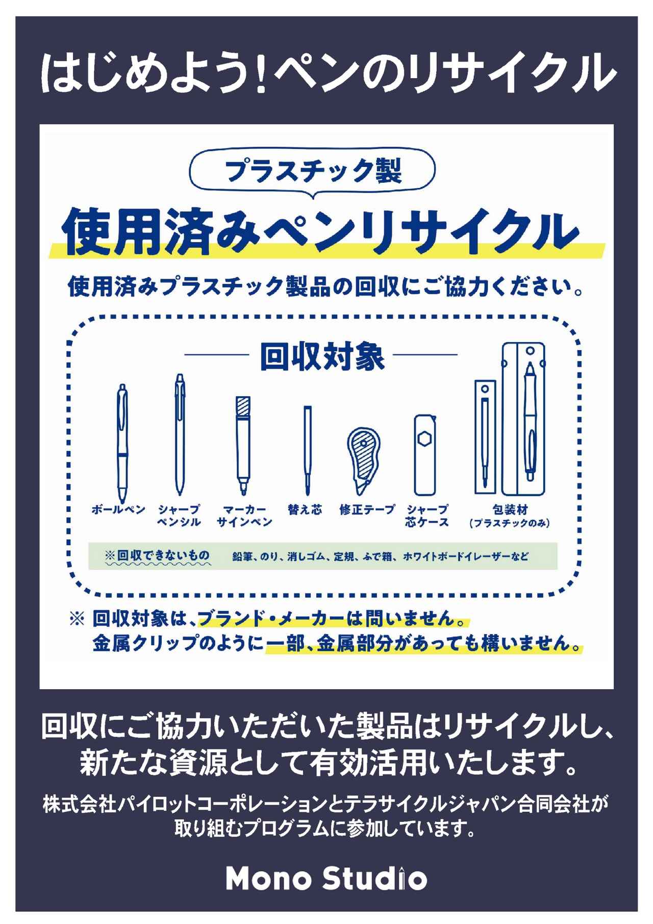 平和堂が直営文具ショップ「Mono Studio」の8店舗において、プラスチック製の使用済みペン類や包装材などを回収しリサイクルする「はじめよう、ペンのリサイクル」を開始。(フロントロウ編集部)
