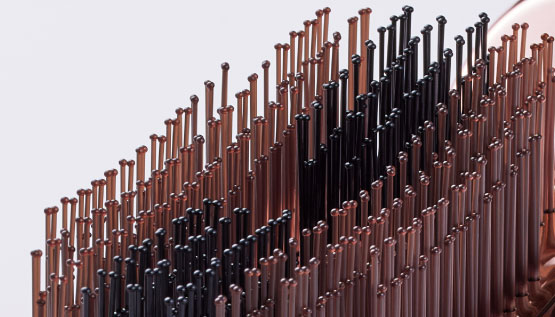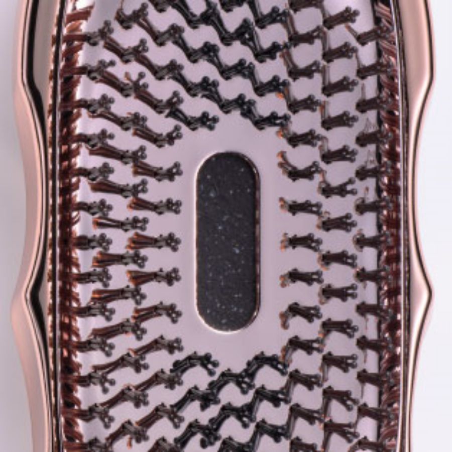 頭皮へのフィット感を高めるためにラウンドホール状に植毛されたピンの数は、従来モデル「リファイオンケアブラシ」の約2倍。ブラシの中央にあるイオンプレートからは、従来モデルよりも多くのイオンが発生する。