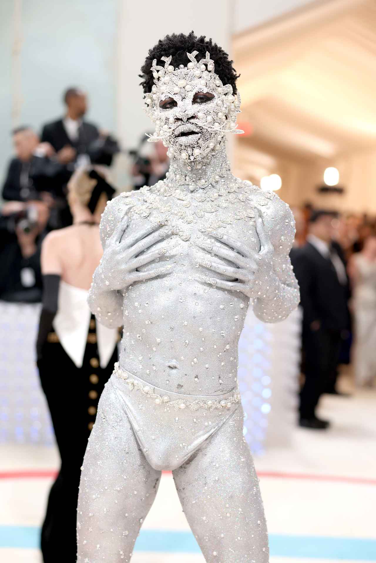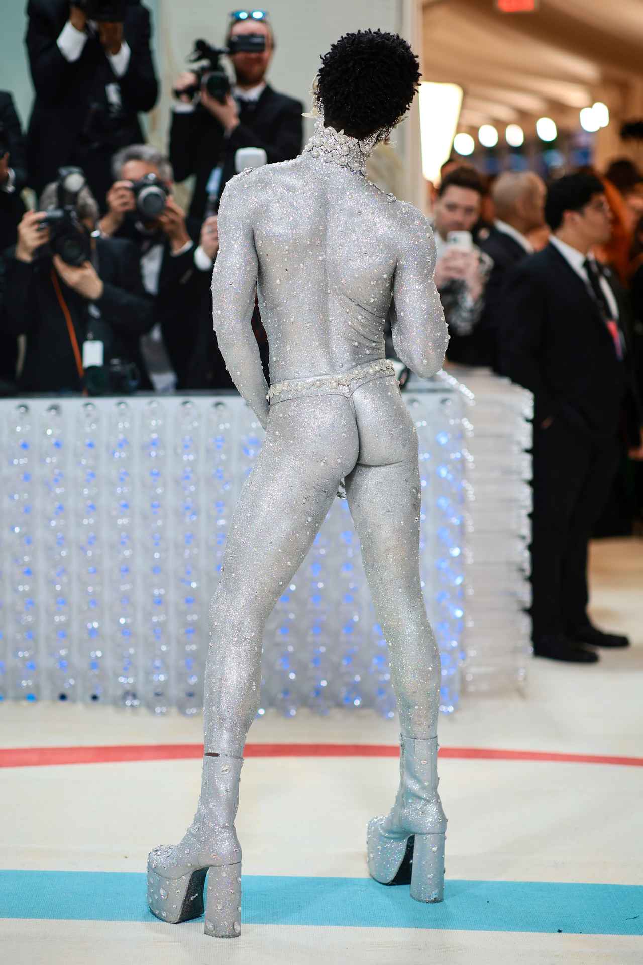 パールとクリスタルをちりばめたシルバーのボディで歩く宝石となって登場した、ラッパーのリル・ナズ・X。DiorのメンズTバックで綺麗なお尻を披露。
