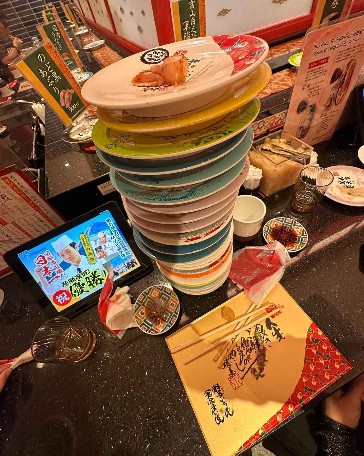 セレブといえば、回らない寿司を楽しむ人が多いが、ここ数年は日本で回転寿司を訪れる人も多く、今回ロザリアたちは「金沢まいもん寿司」へ。ロザリアたちはかなりの量を食べたようで、カウンターテーブルの前には大量のお皿が。