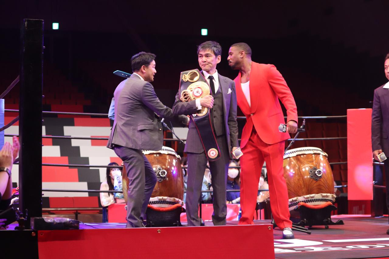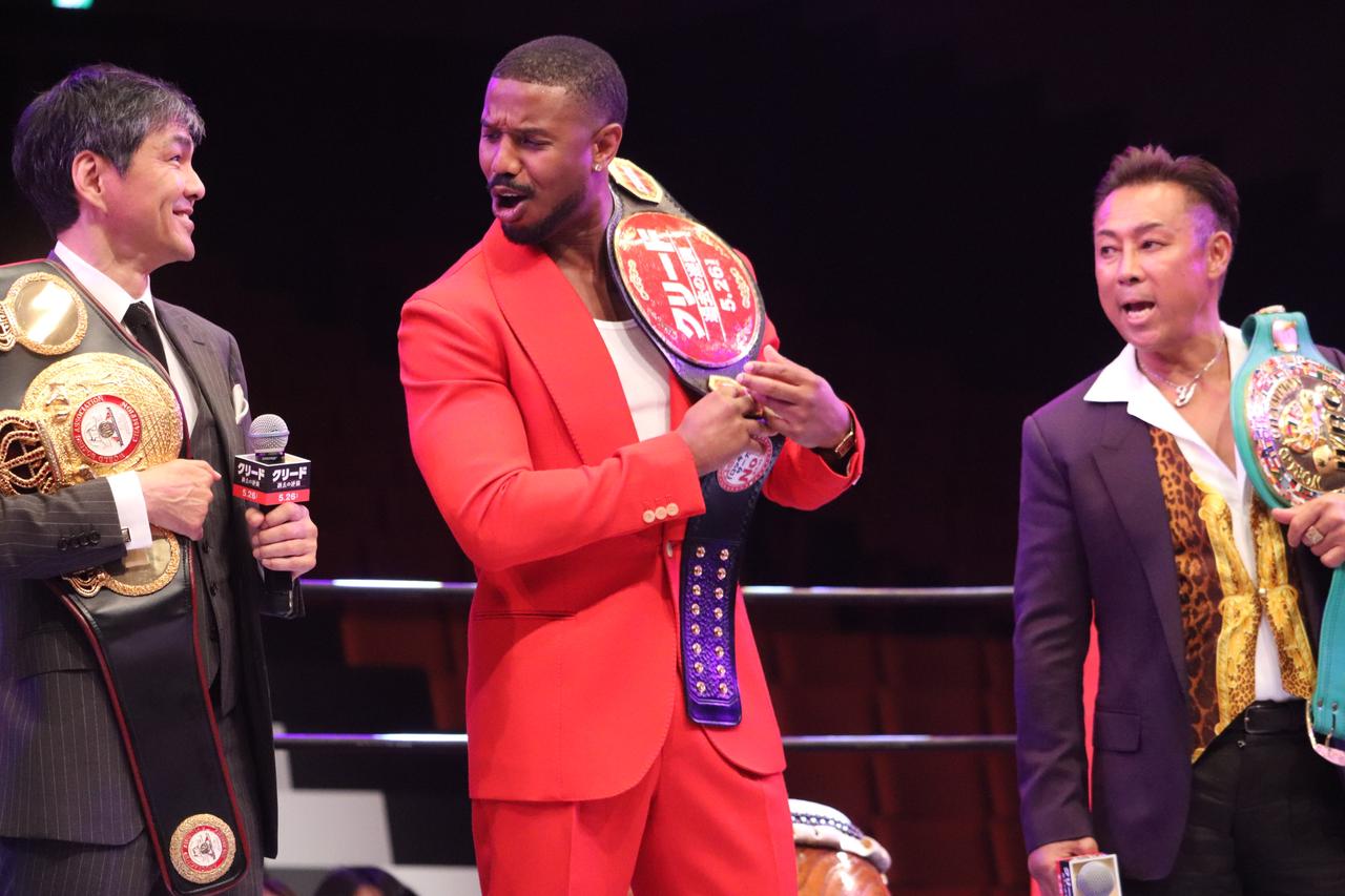 映画『クリード 過去の逆襲』仕様のチャンピオンベルトをもらい、みんなで並んで記念撮影をすることになったマイケル。チャンピオンたちとファイティングポーズで写りたかったようで、“やろうよ”といった感じで、みんなにおねだりして念願のショットをゲットしていた。