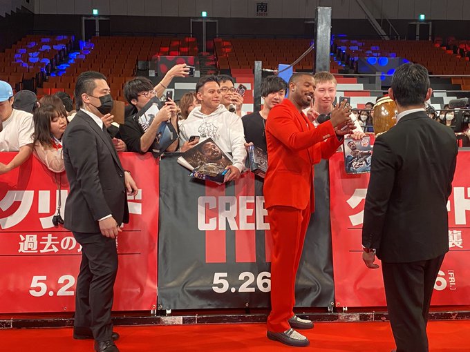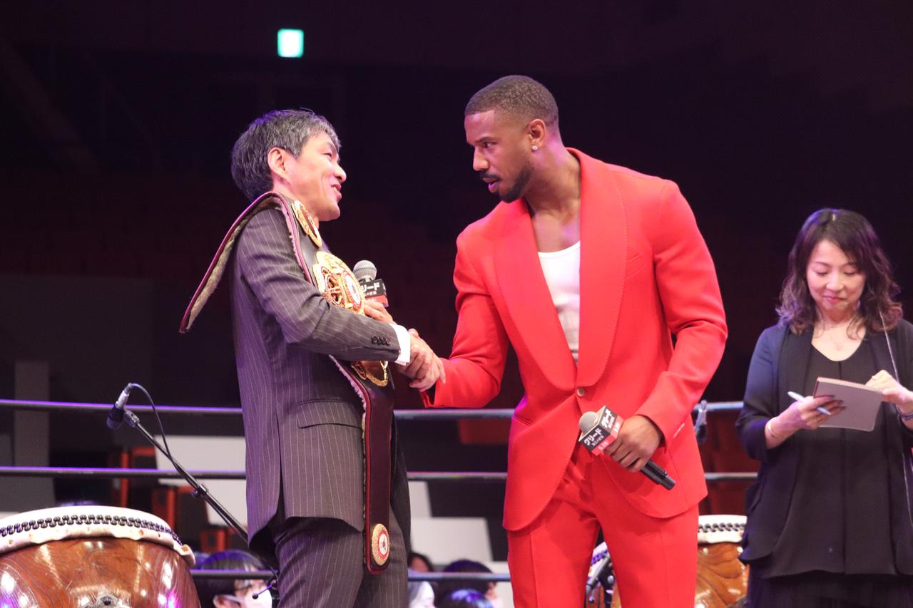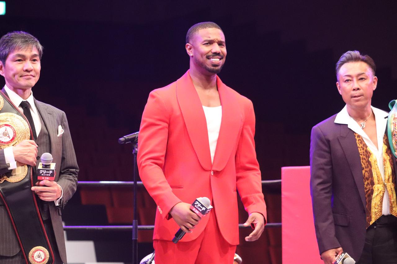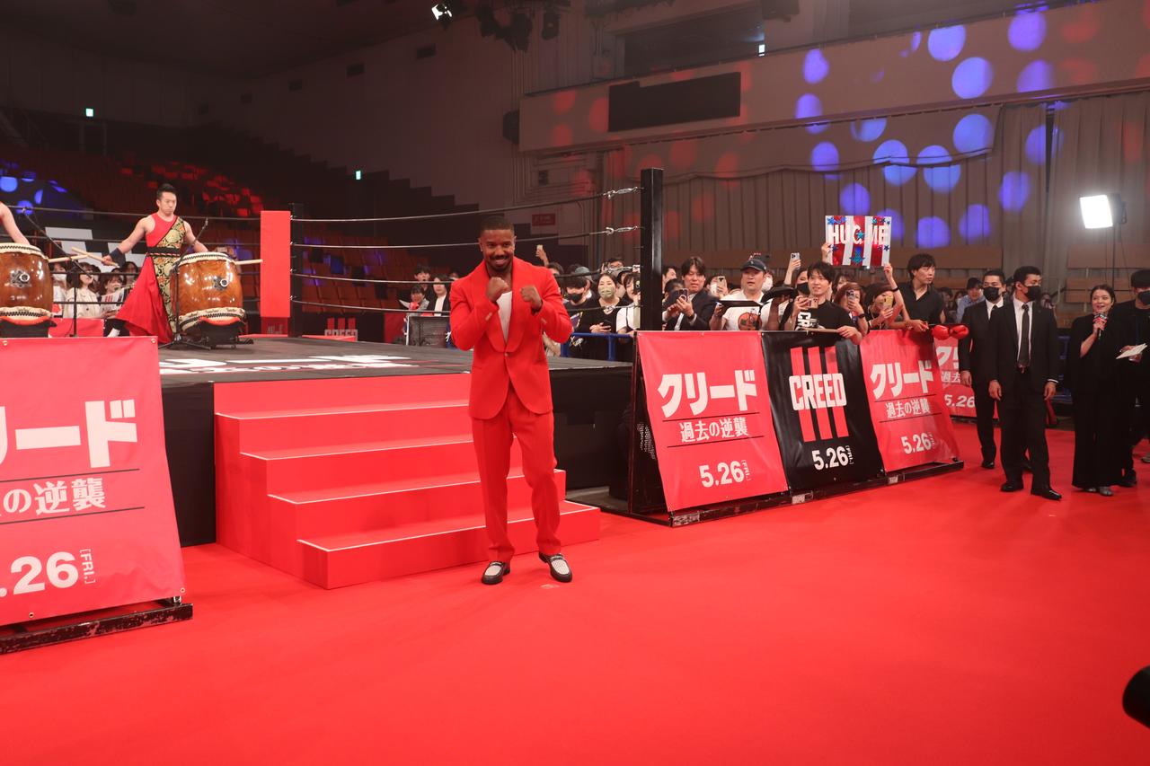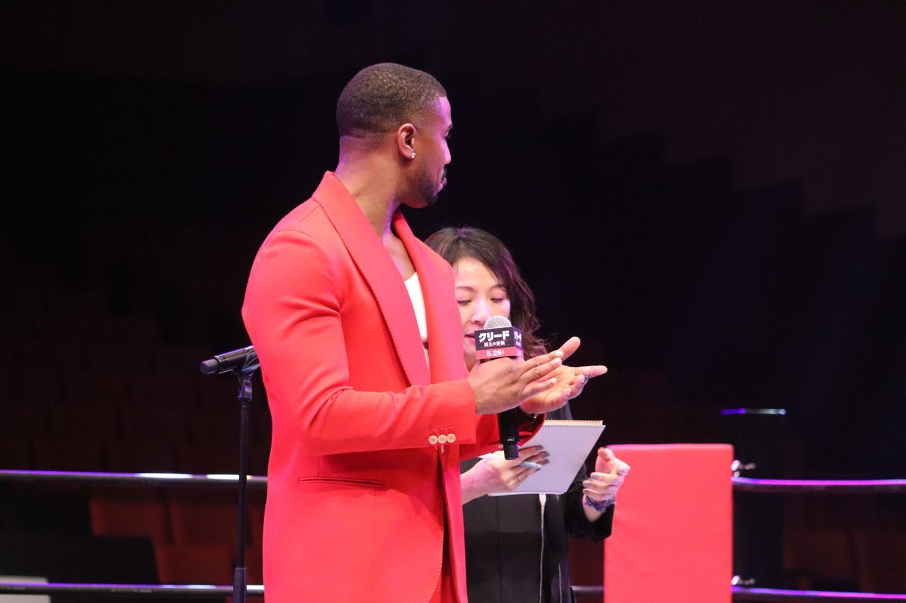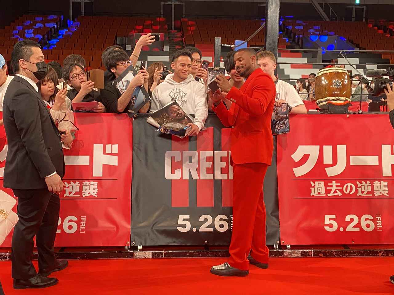 ジャパンプレミア レッドカーペットイベントでは、フォトコールや取材に対応しながら、ステージとなったボクシングリングを囲むファンに意識を向けるのを忘れなかったマイケル。ちょっとした時に手を振ることもあれば、フォトコール中にファンから「アイラブユー(愛してる)」とシャウトされると、「アイラブユートゥー(俺も愛している)」とシャウトバック。