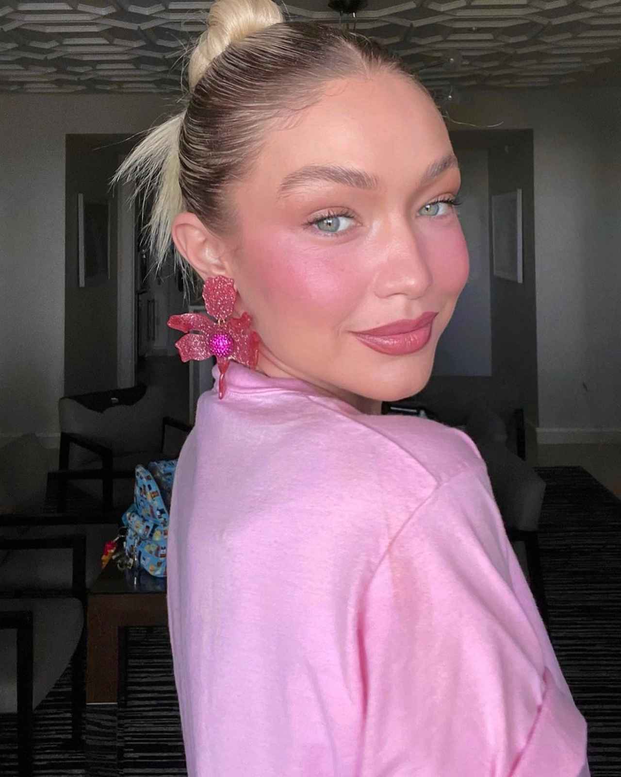 モデルのジジ・ハディッドは、チークとリップにピンクをチョイスしたピンクメイクを披露。あえて目元のみすっぴん風のナチュラルメイクにすることで、こなれ感のある大人っぽいメイクが完成。