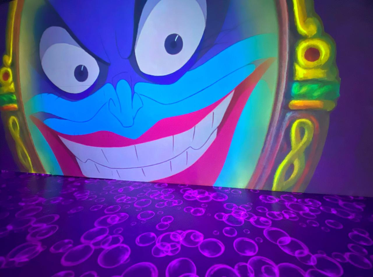 「ヴィランズ・ルームでは、歩くと弾けるインタラクティブな泡を床に投影しているのが特徴です。そして、フレームの中には動くヴィランズがいます。これらは他の会場ではやっていません。手描きのアートもあれば、映画の最終フレームの完成品もあり、これも今回が初めてなんです。だから、あのヴィランズ・ルームは特別なのです。今回のイベントで、日本だけの特別な体験をぜひ楽しんでいただきたいです」。