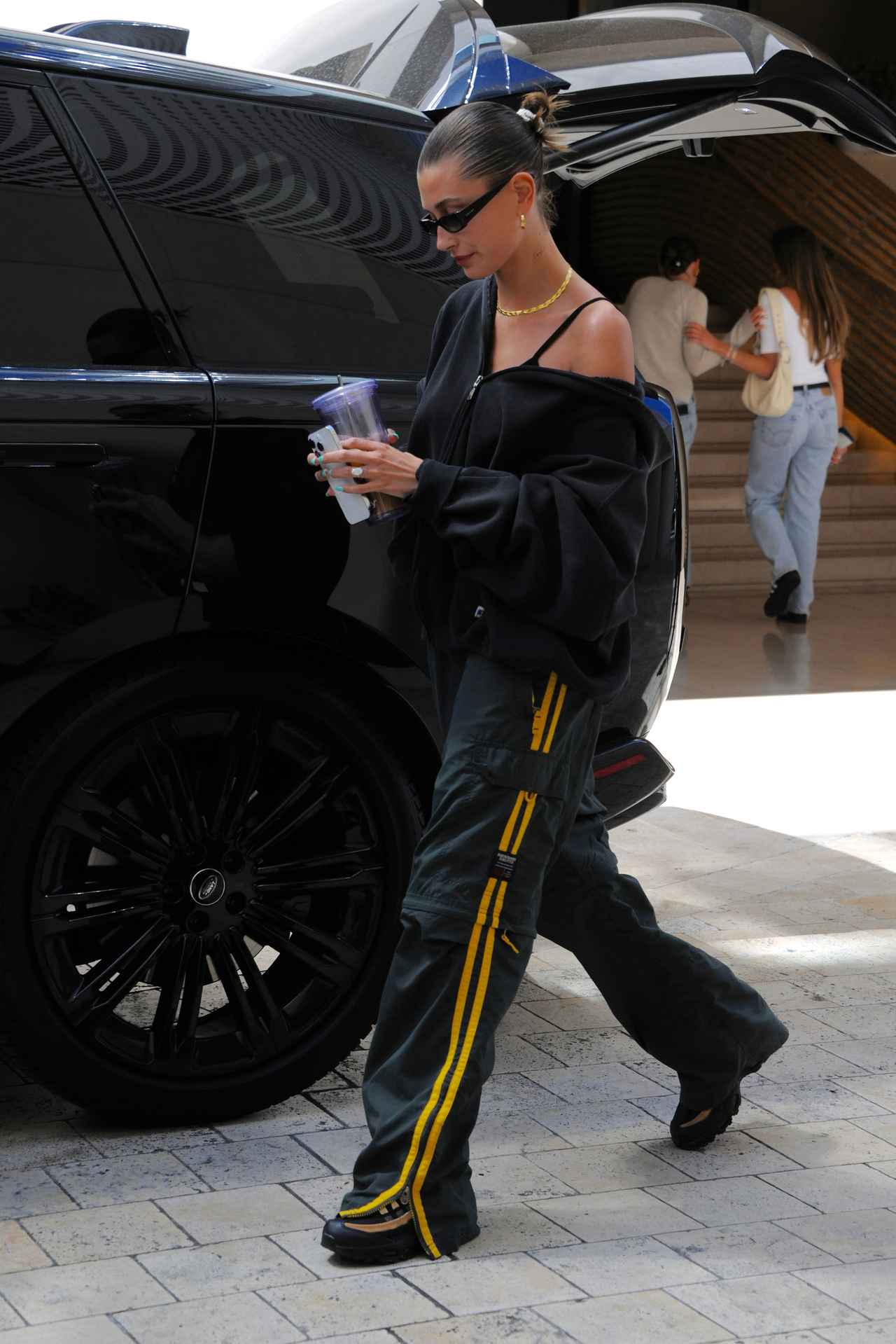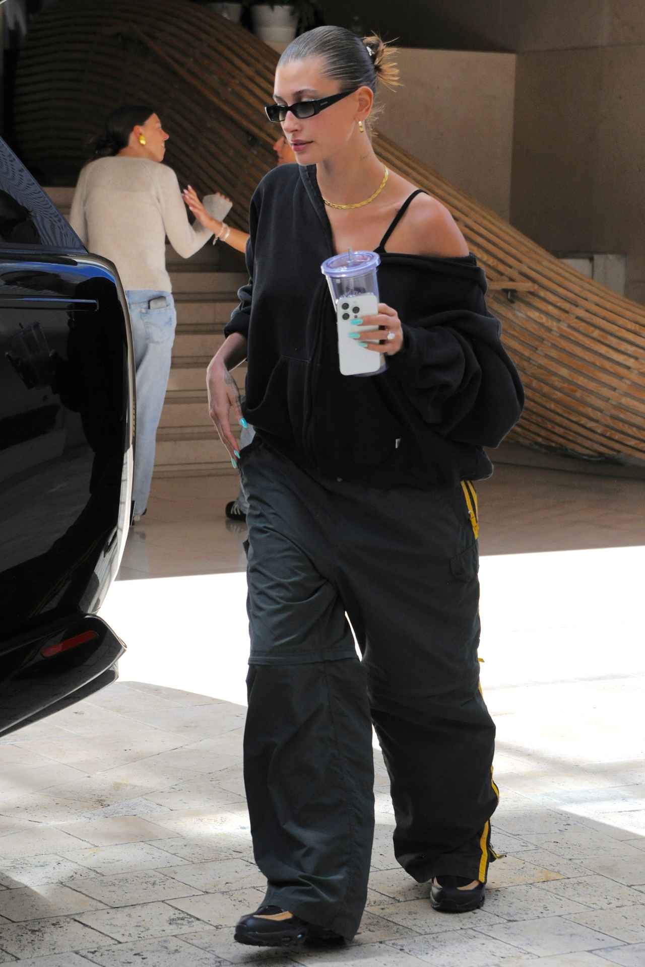 ロサンゼルスで行なわれたミーティングに参加したヘイリー・ビーバーは、いつもよりカジュアルなスタイルで登場。オーバーサイズのシンプルなパーカをダボっと着用して片側の肩を落とし、アスレジャースタイルで肌見せしたのがヘイリーらしいスタイリング。