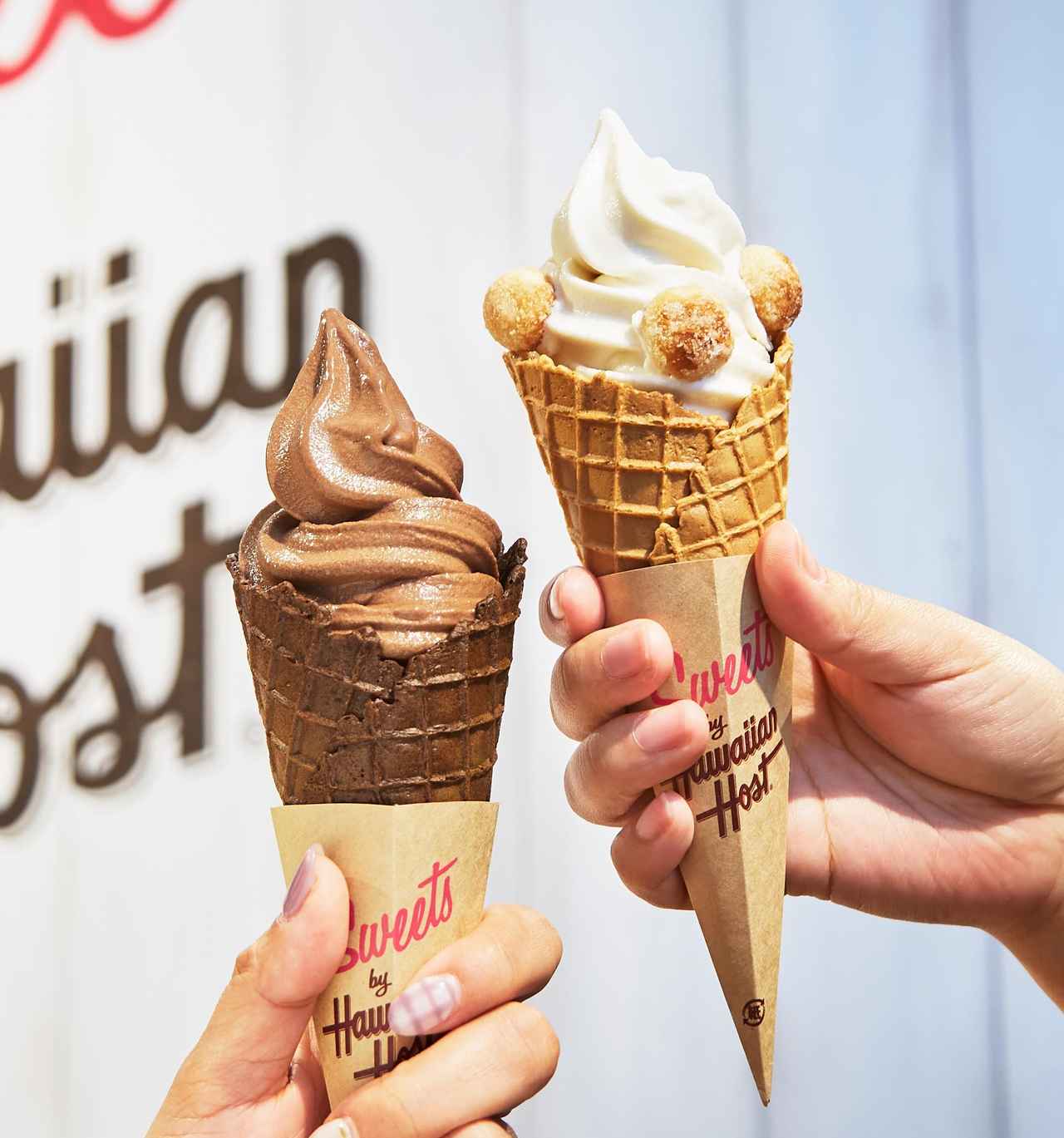 <スイーツバイ ハワイアンホースト> 左)ダークチョコレートマカデミアソフト 594円 右)ハニーロースト マカデミアソフト 495円